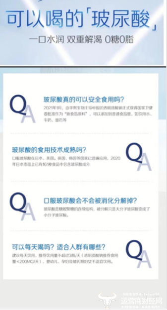 从其发布的消息来看,玻尿酸食品企业很少在其营销广告和营销页面宣传其产品可以“顺滑”,但会做很多铺垫和暗示。比如,在玻尿酸饮用水的销售页面中,某生物公司旗下的水基泉饮料旗舰店突出了“可饮用玻尿酸”和“双重解渴”,提示饮用水中的玻尿酸可以给皮肤补水。