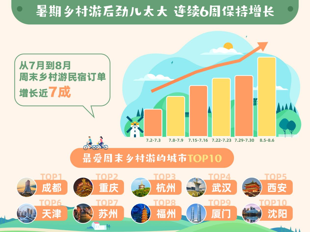 8月10日,记者从携程获悉,进入暑假以来,农村民宿订单量连续6个周末增长,整体增速超过60%。从暑假到初秋,乡村旅游一直在蓬勃发展。不少新一线城市成为周末乡村旅游的主要客源,其中成都、重庆、杭州、武汉、Xi、天津、苏州、福州、厦门、沈阳是乡村旅游热情最高的城市。