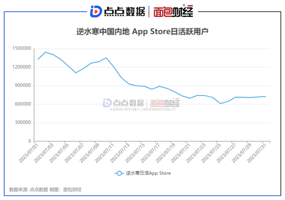 但值得一提的是,7月以来,mainland China App Store中“逆水行舟”的日活跃用户整体呈下降趋势。据一点数据显示,7月31日,该游戏在中国大陆的App Store日活跃用户数约为73万,较峰值下降近50%,但仍维持在较高水平。