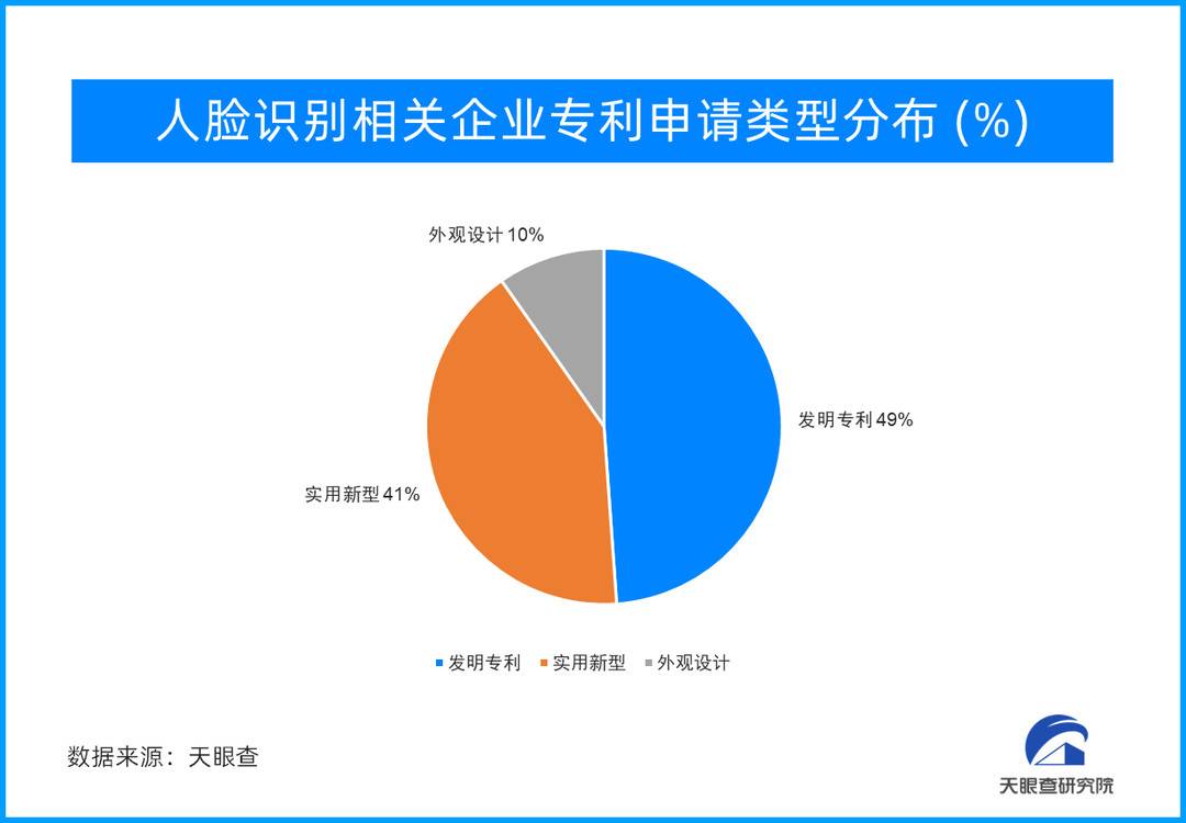 天眼查的专利数据显示,从人脸识别相关的专利申请类型来看,发明专利和实用新型位居前列,分别超过8900件和7600件,占总数的90%。