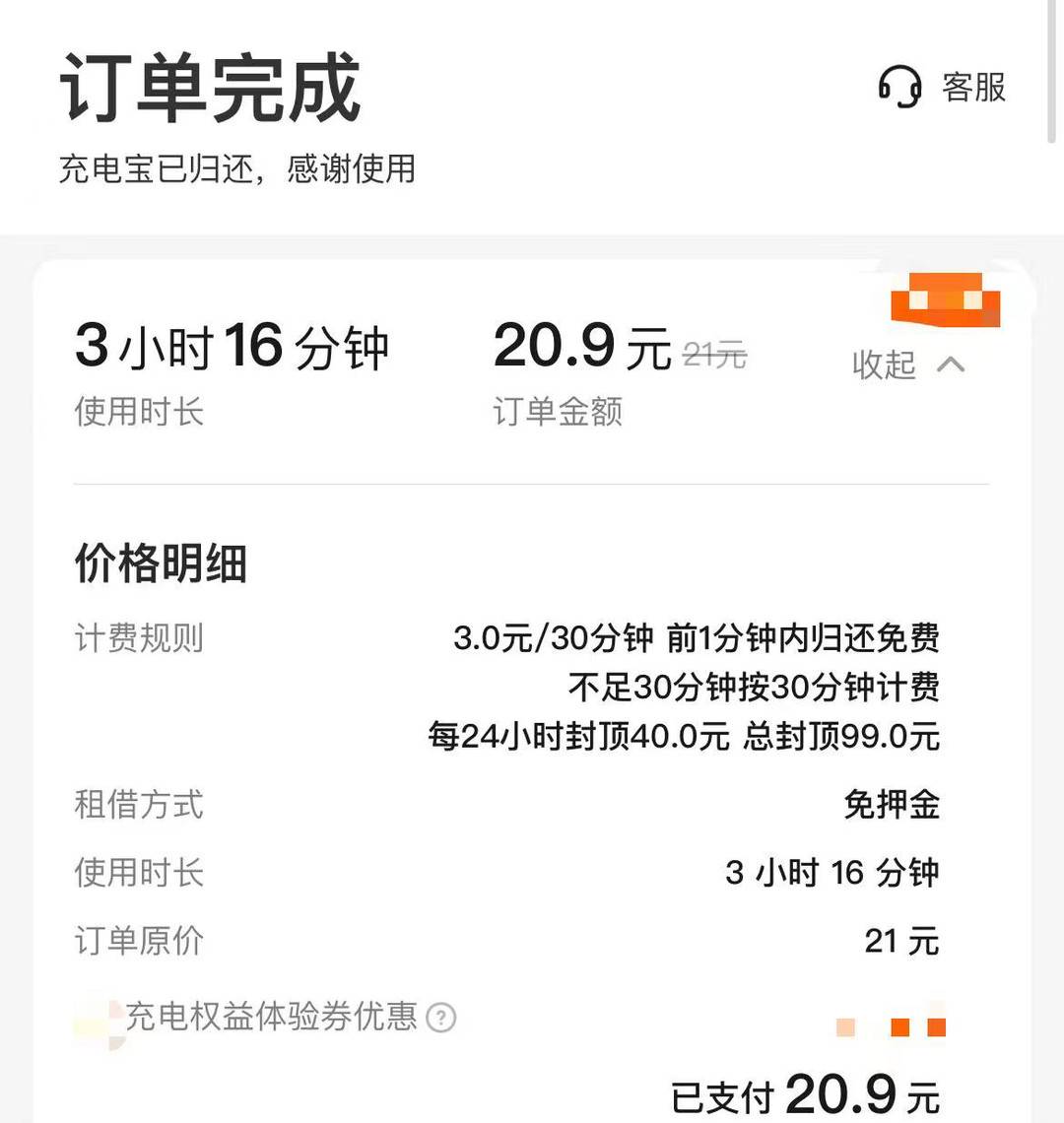 成都市民张女士的一份账单显示,短短3小时16分钟,收费高达20.9元。“价格高了,但是相应的服务没有跟上。”张女士告诉记者,共享充电宝的充电效率并没有得到很大的提升。有时候一个小时只能充三分之一到一半的电,租用时间还得延长。