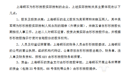 然而,2023年1月3日,吉祥股份披露了“前次公告内容更正”的公告,称二股东上海石纲为公司间接控股股东杉杉控股的实际控制企业。更正显示,上海石纲的名义股东为吴俊辉和宋晓瑜。其中,吴军辉与居正有关联,是公司原实控人郑永刚的姻亲(侄子、女婿)。宋晓瑜曾长期在杉杉控股工作。上述两人对上海石纲的经营和投资决策实际上是由杉杉控股作出的,他们根据杉杉控股的指令对吉祥股份行使股东权利。