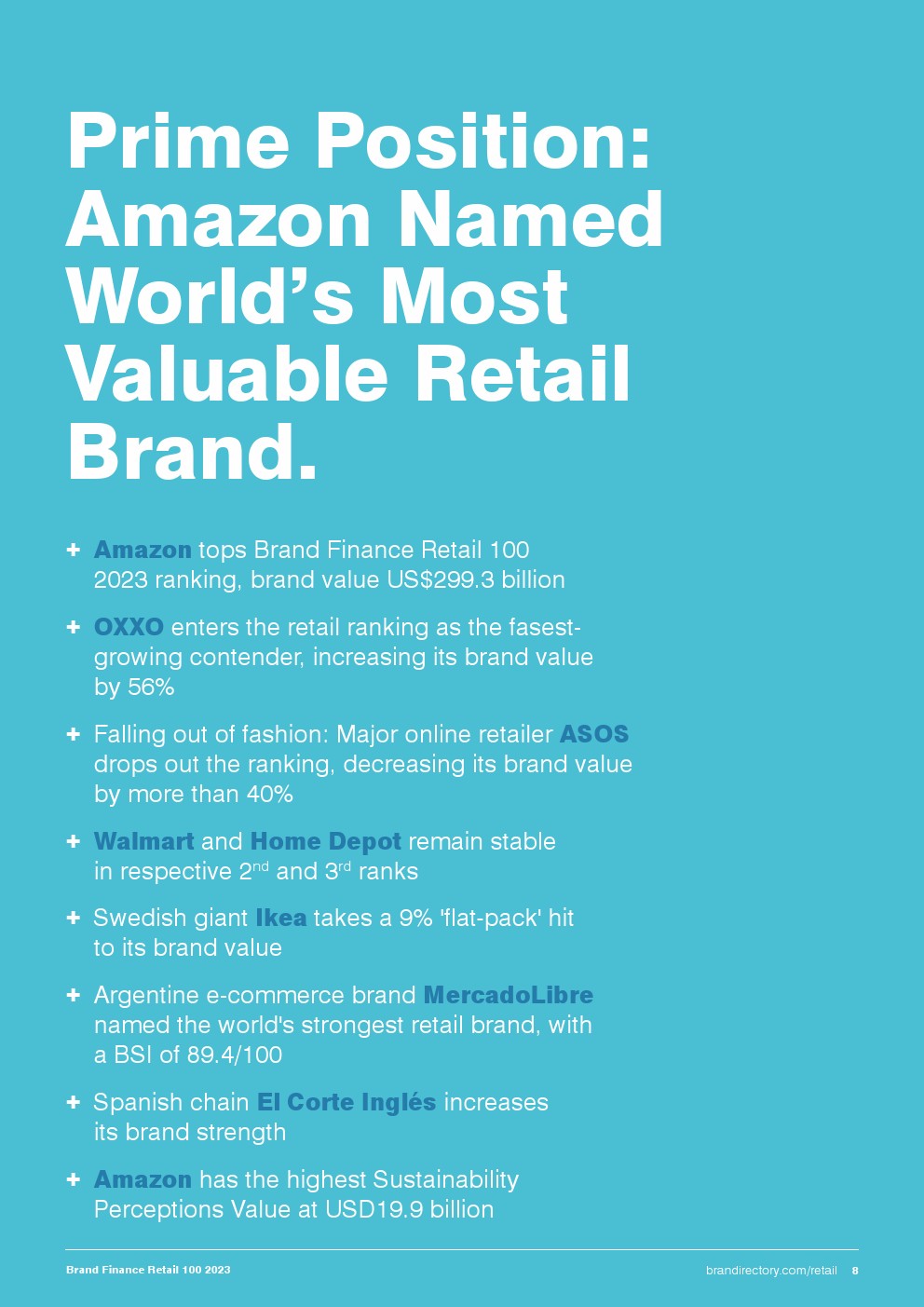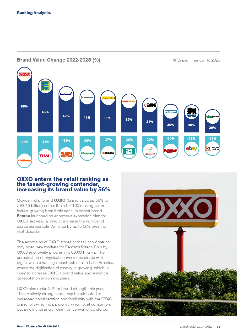 作为增长最快的竞争对手,OXXO进入零售排名,品牌价值增长56%。