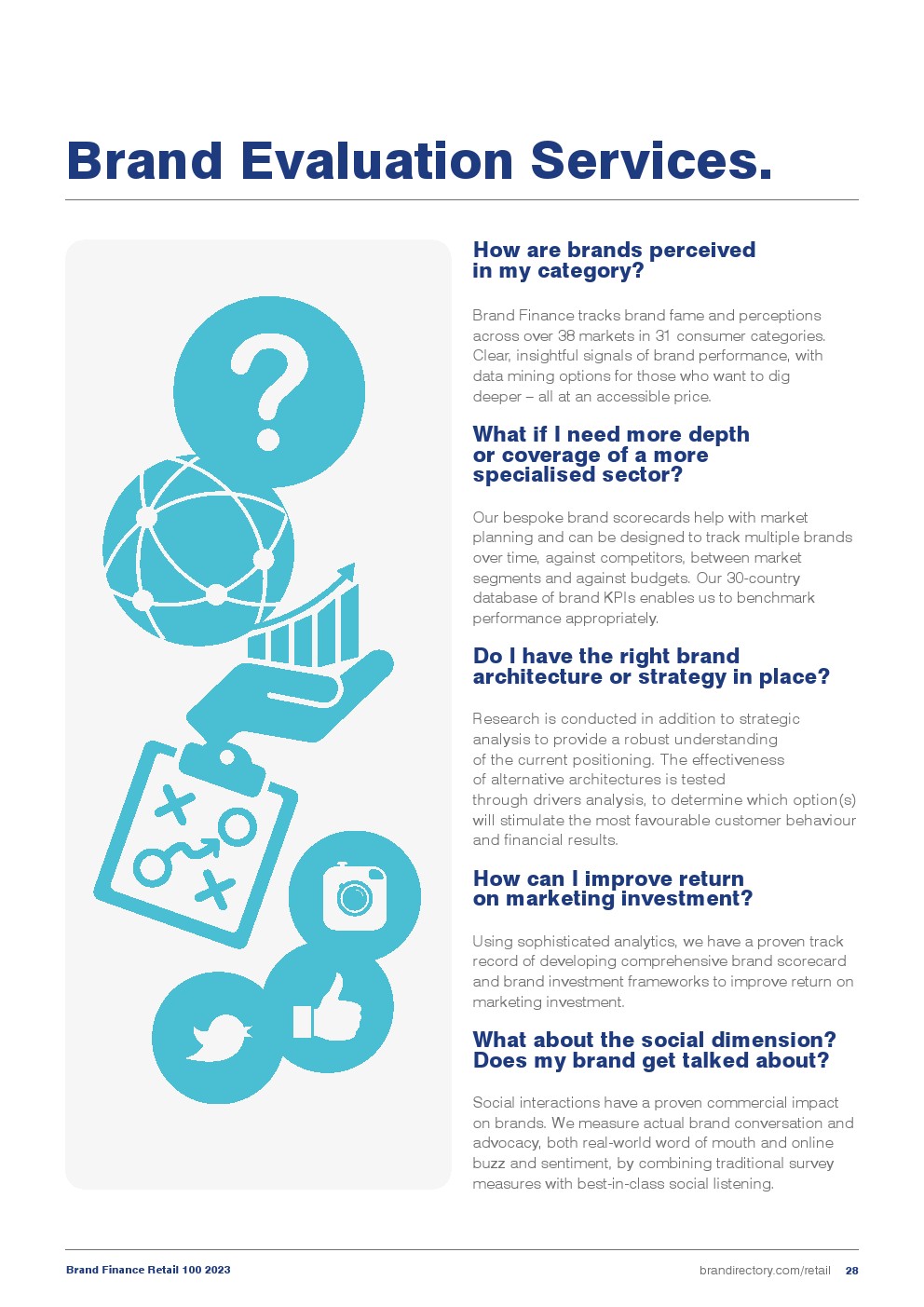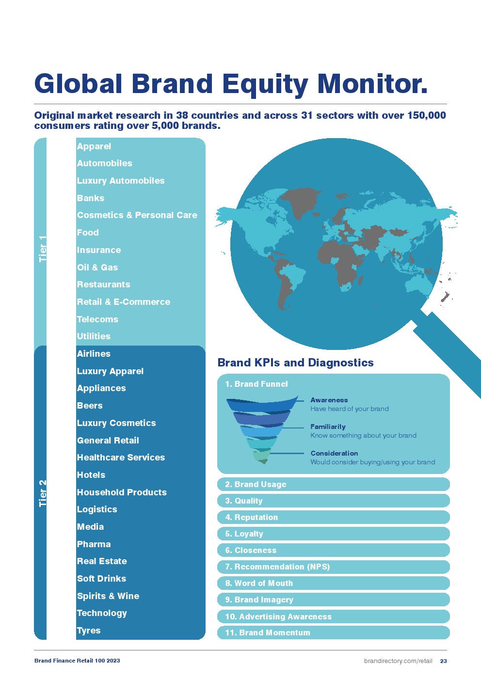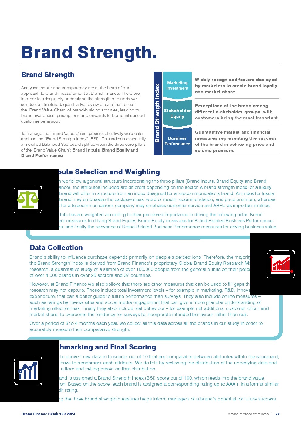 除了计算品牌价值,品牌财务还通过平衡计分卡对营销投入、利益相关者权益和经营业绩进行评估,从而确定品牌的相对实力。品牌金融对利益相关者权益的评估符合ISO 20671标准,包含了来自38个国家31个行业超过10万名受访者的原始市场调研数据。