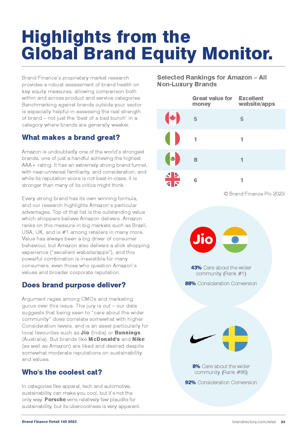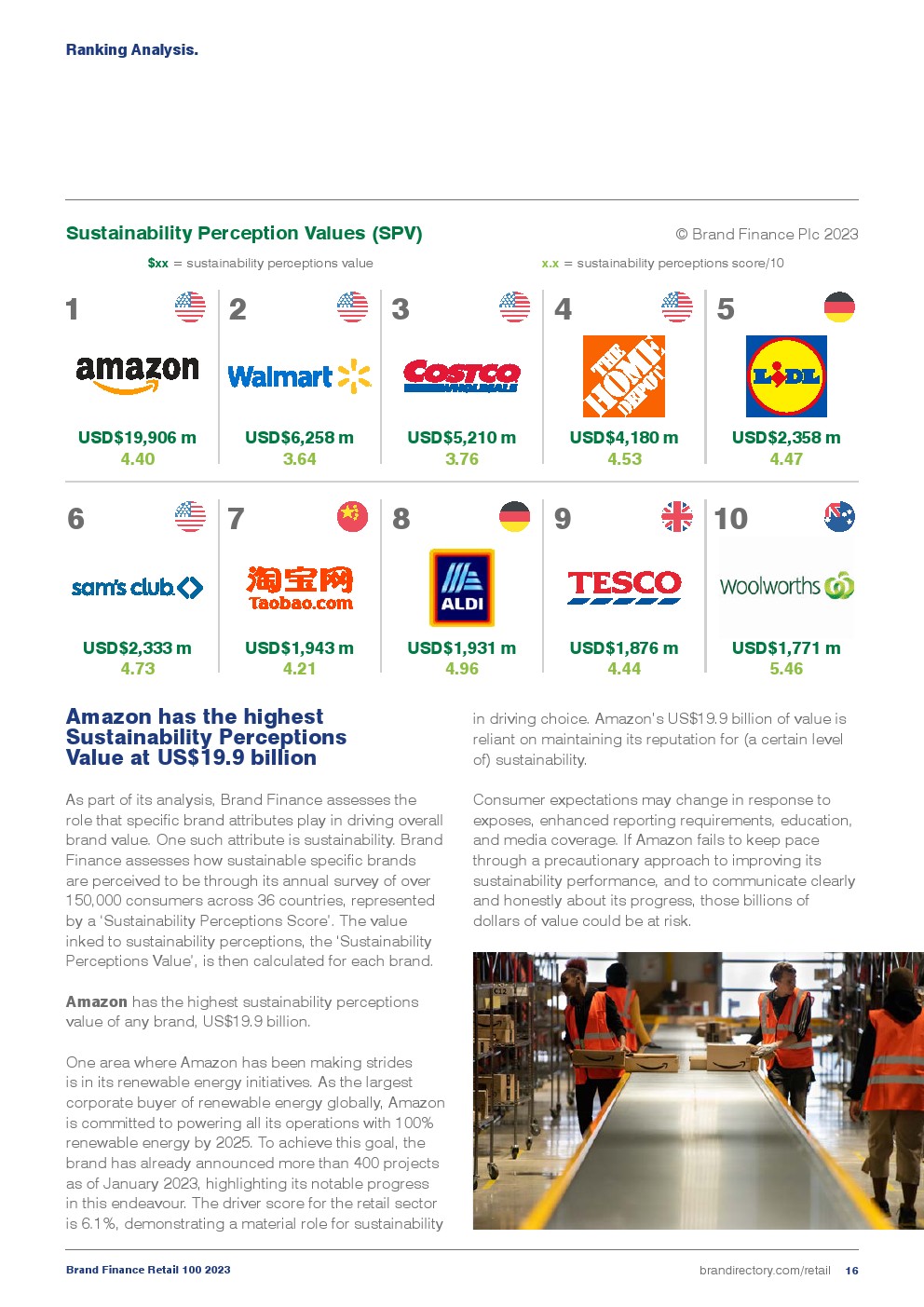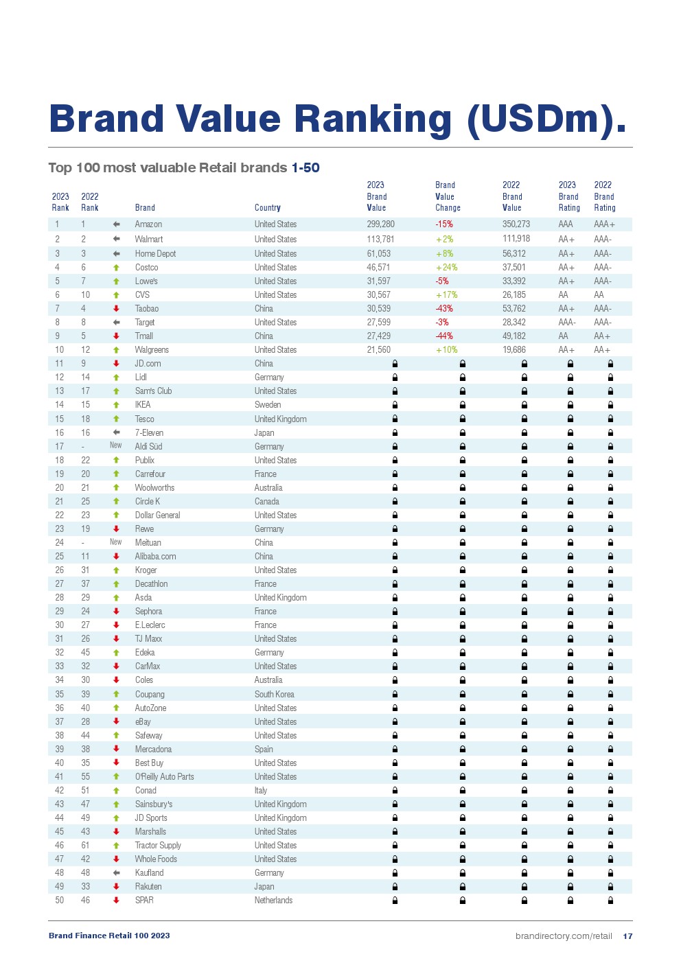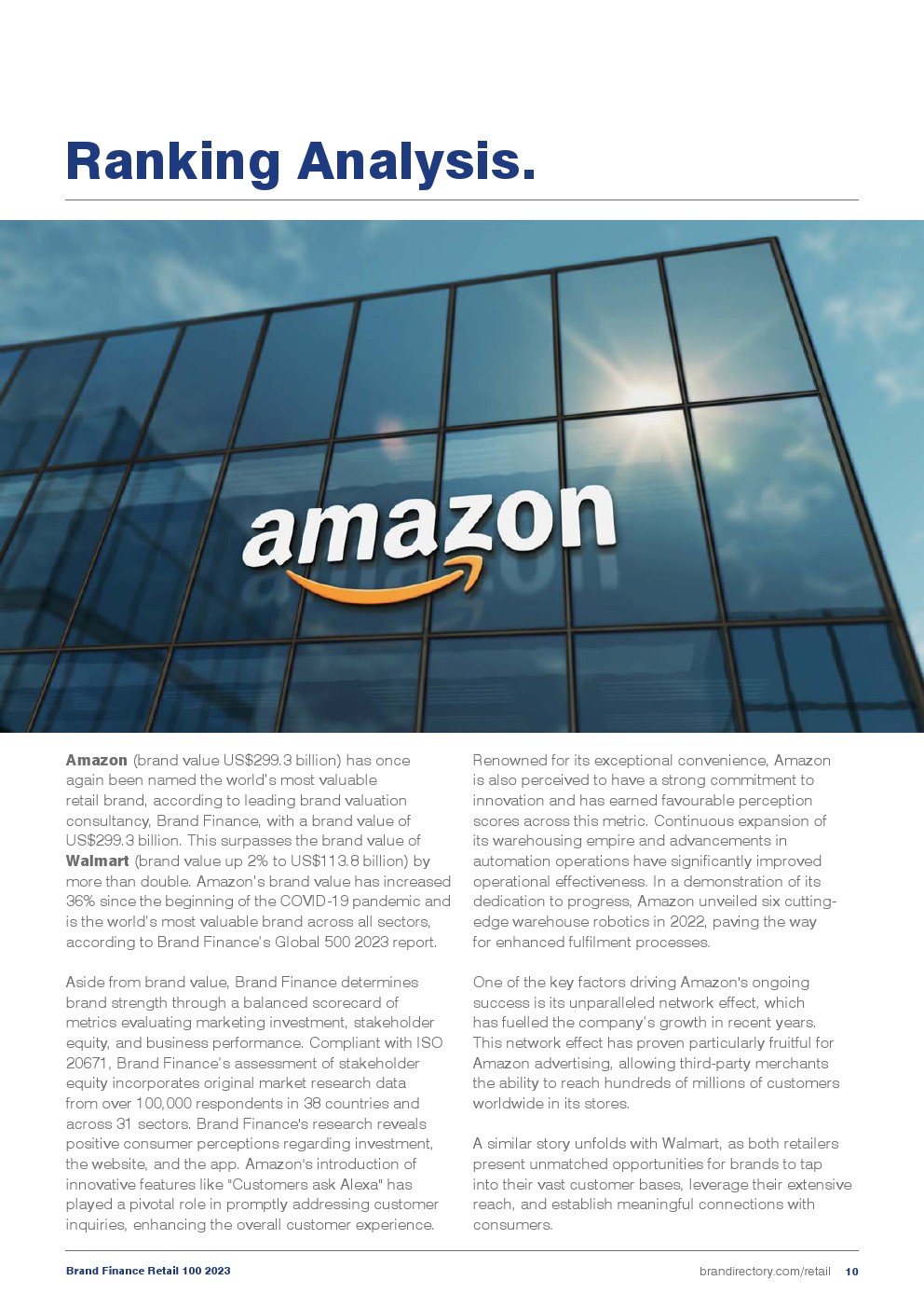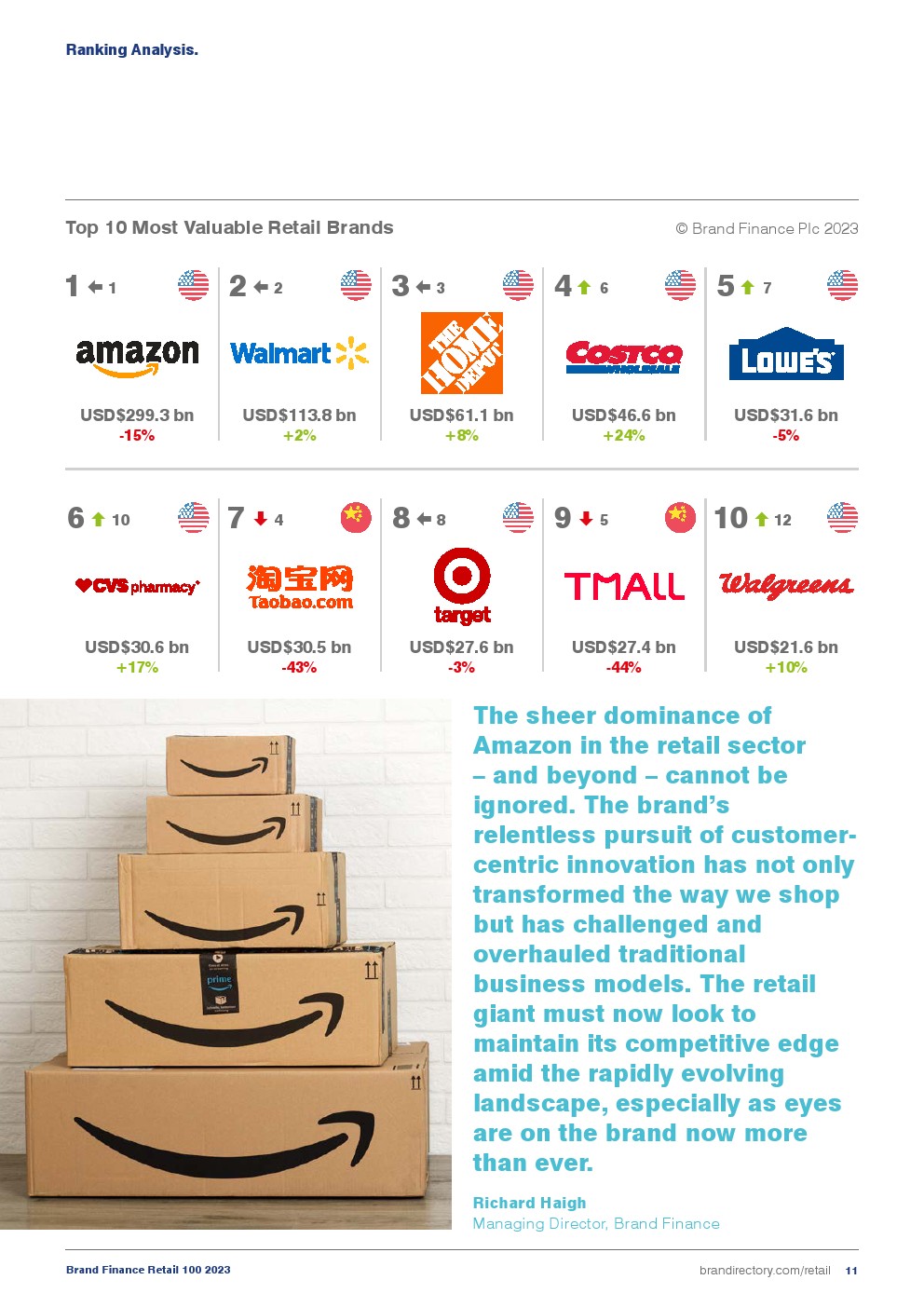 根据Brand Finance发布的“2023年零售品牌100强”,亚马逊以2993亿美元的品牌价值再次被评为全球最有价值的零售品牌。这是沃尔玛品牌价值的两倍多(品牌价值增长2%,达到1138亿美元)。自新冠肺炎走红以来,亚马逊的品牌价值增长了36%,成为全球所有行业中最有价值的品牌。