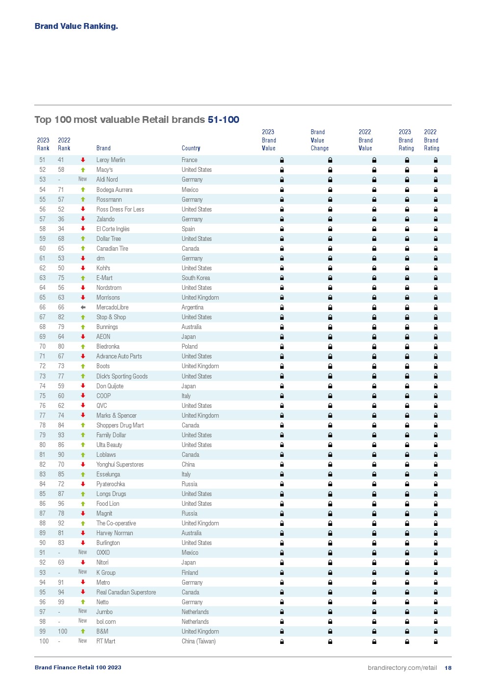墨西哥零售品牌OXXO(品牌价值增长56%至23亿美元)进入零售商百强名单,成为今年增长最快的品牌。去年,其母品牌Femsa in为OXXO推出了庞大的扩张计划,目标是在未来十年内将拉丁美洲的门店数量增加一半。
