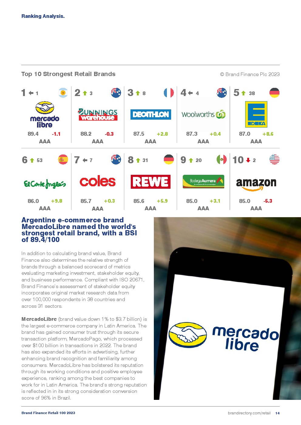 阿根廷电商品牌“自由市场”被评为全球最强零售品牌,得分为89.4/100。