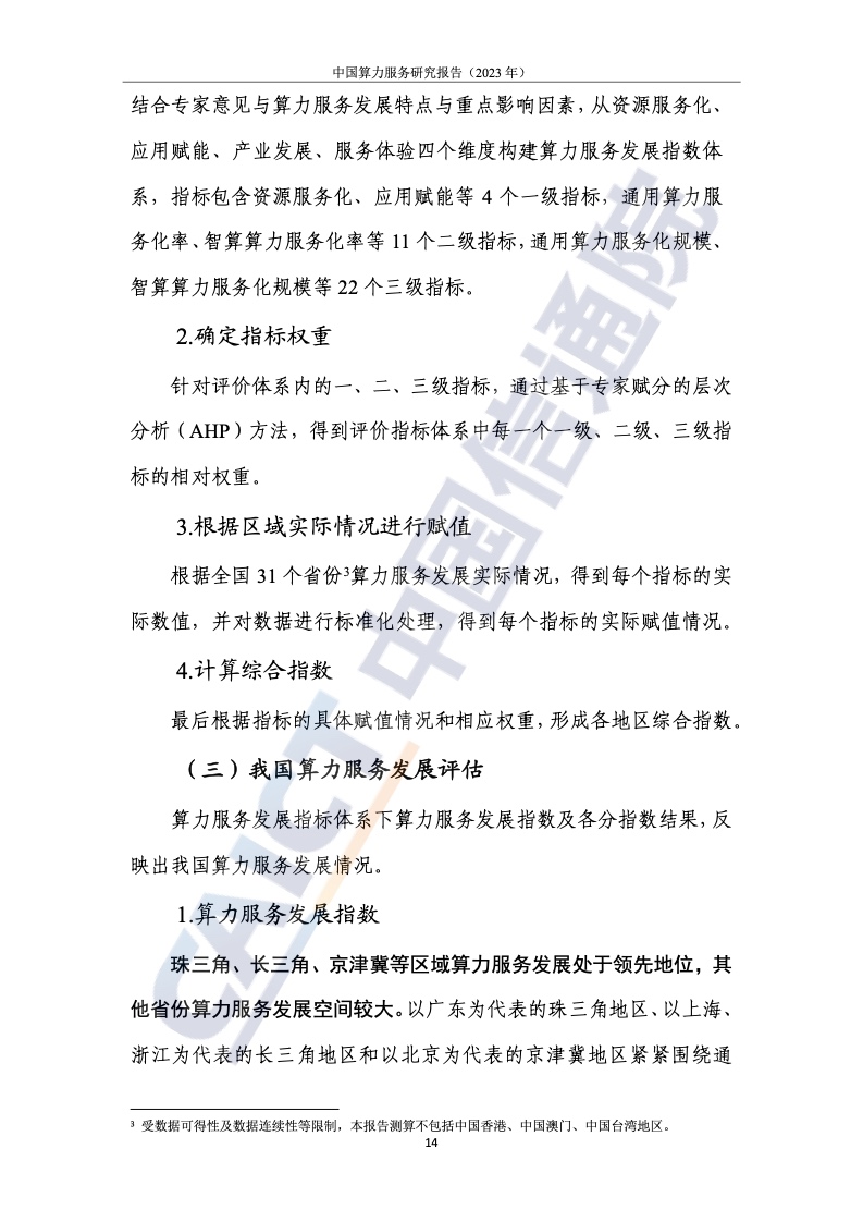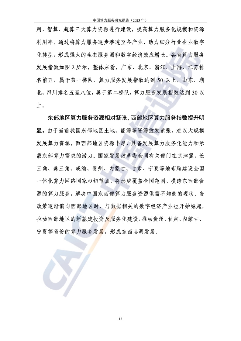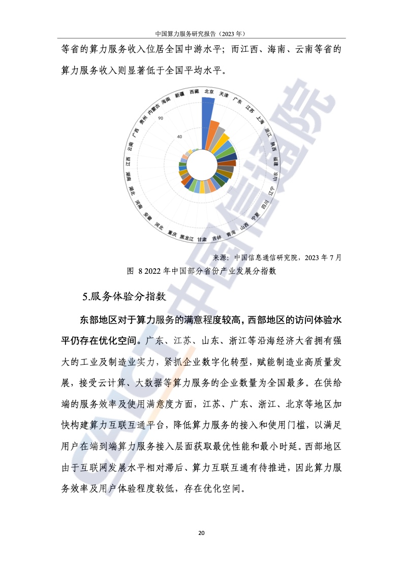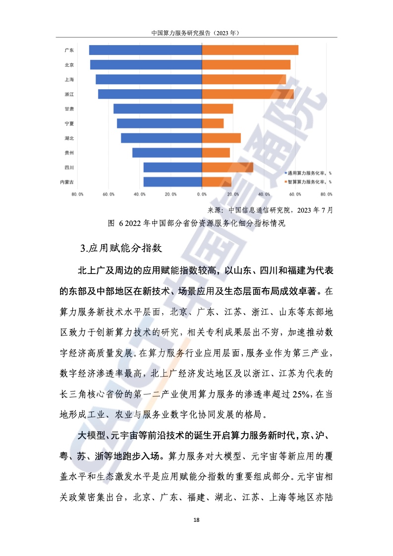 2.北上广计算服务指数处于领先地位,中西部地区提升明显,但差距较大。为了客观、全面地衡量我国各省计算力的服务水平和产业赋能水平,报告提出了计算力服务发展的指标体系,从资源的服务水平、应用赋能水平和服务体验水平三个维度进行研究。整体来看,我国珠三角、长三角、京津冀等区域计算服务处于领先地位。与东部相比,西部地区土地、能源等资源丰富,发展潜力巨大。例如,四川凭借区位优势已晋升至第八位,但西部整体计算服务水平仍有待提高。