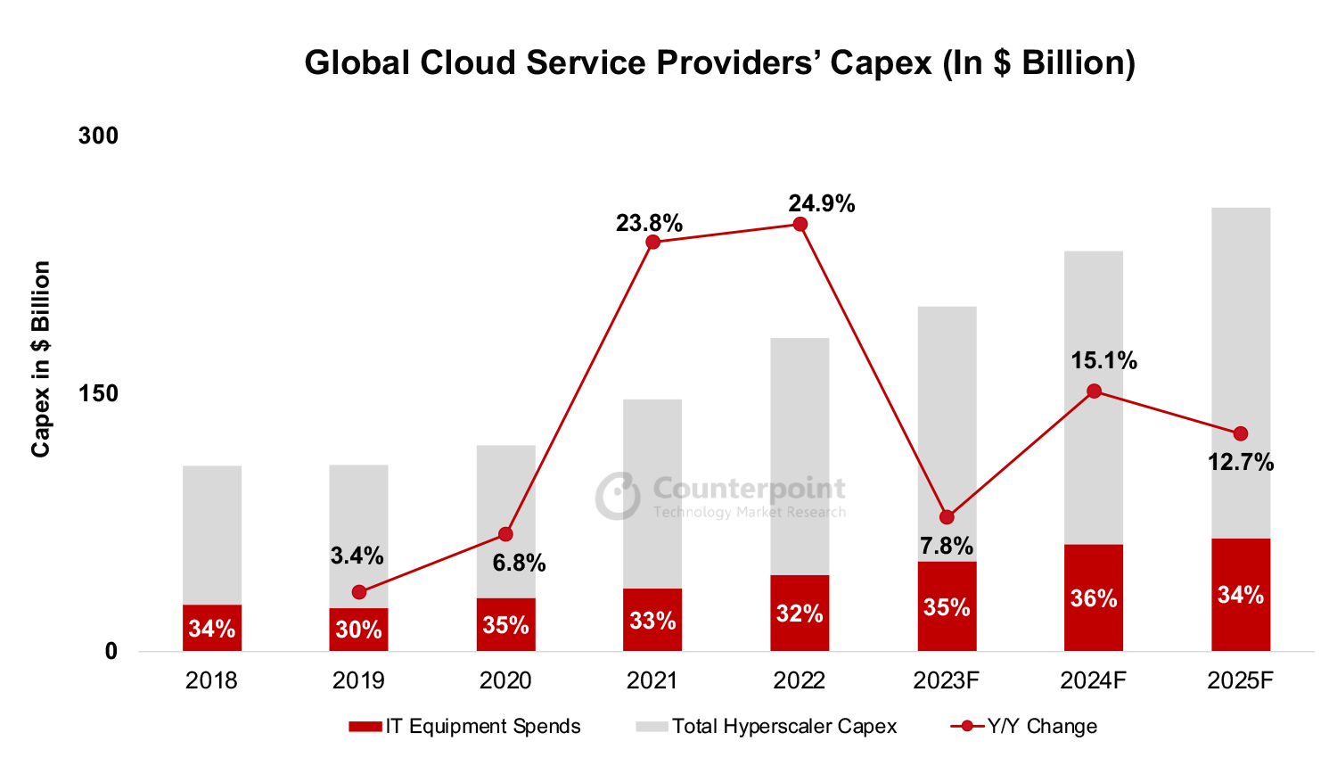 根据Counterpoint的最新研究,预计2023年全球云服务提供商的资本支出将增长7.8%。与2022年相比,更高的债务成本、企业支出削减和云收入增长放缓正在影响数据中心的基础设施支出。