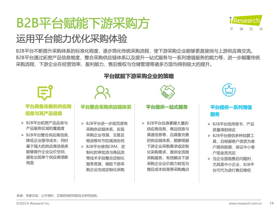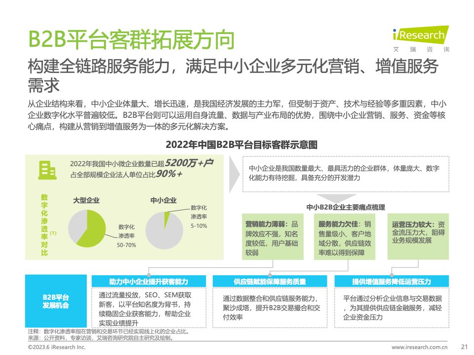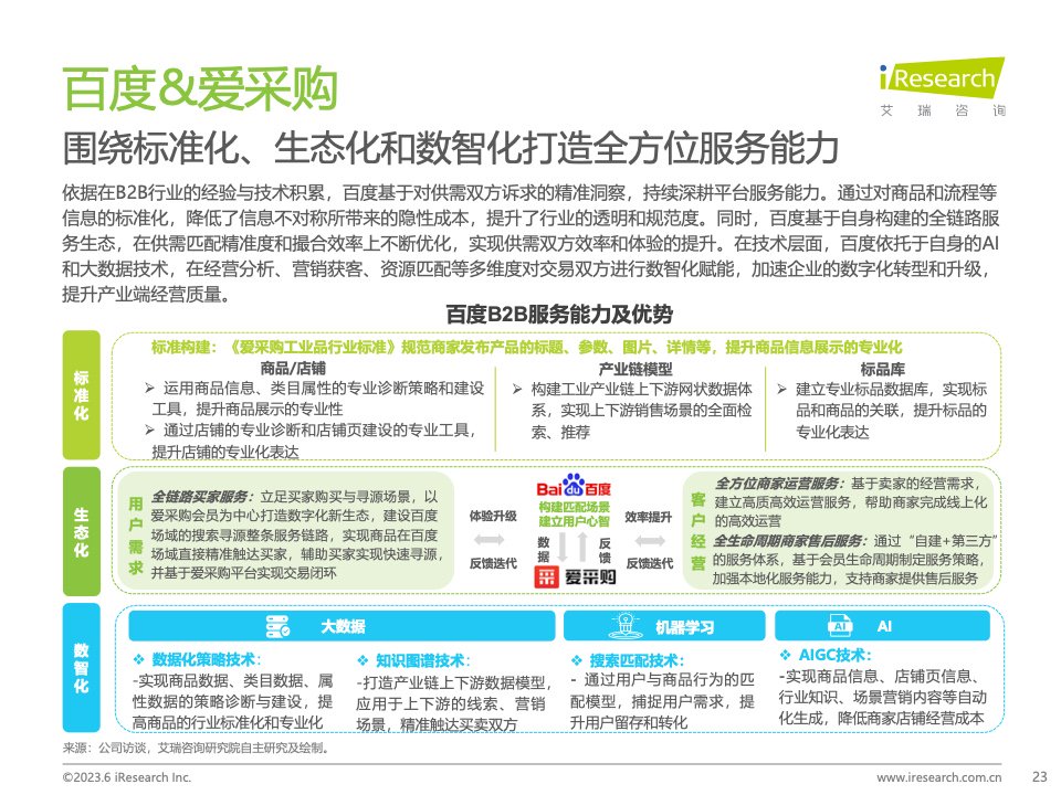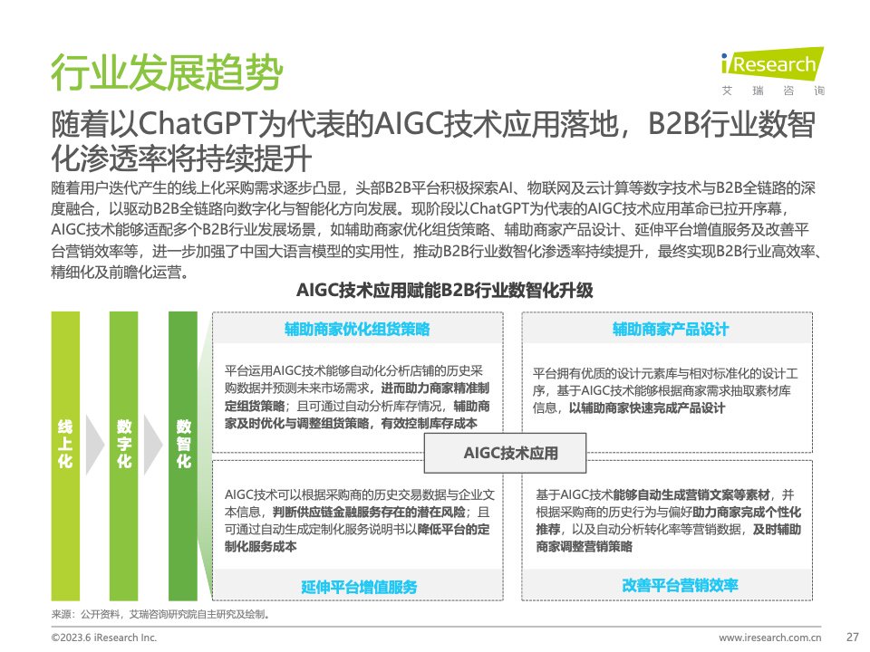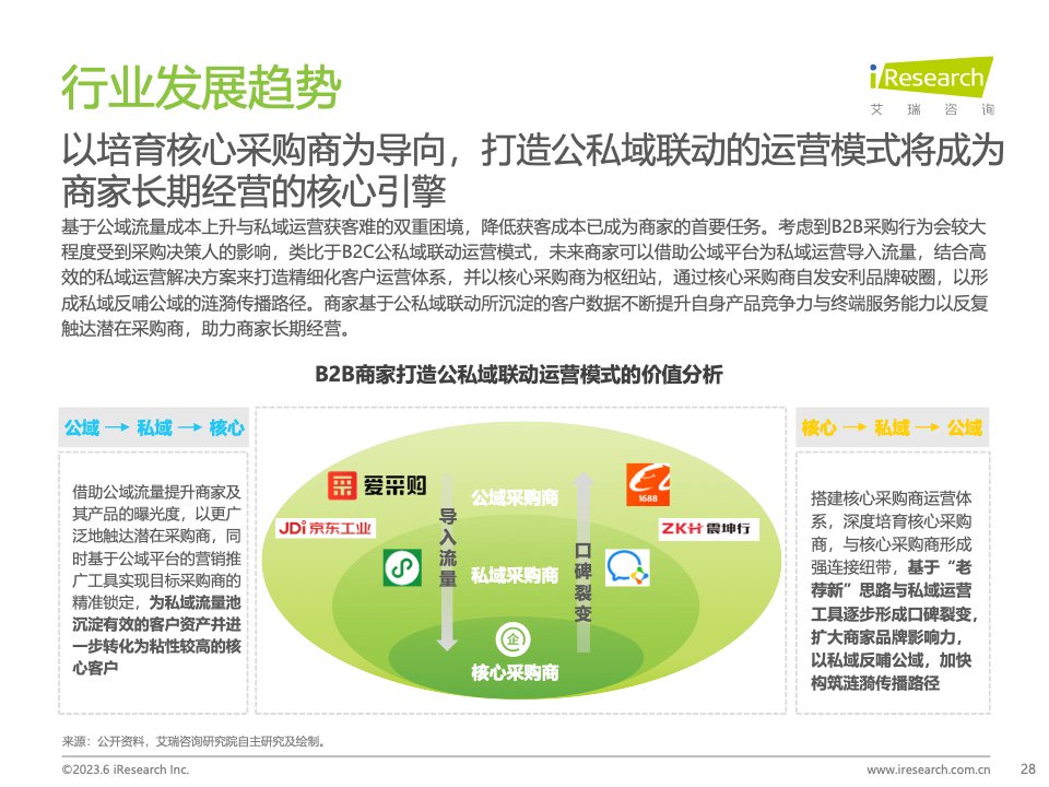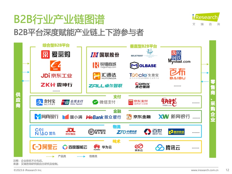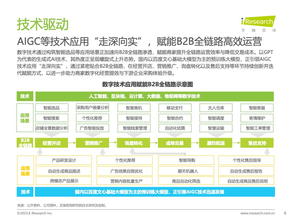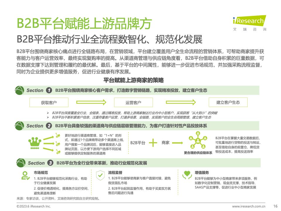 政策执行、技术进步、数字经济增长、资本助力,为B2B行业提供了良好的发展土壤。在这个过程中,B2B平台利用综合服务能力为产业链上下游提供全流程支持:对于产业链上游,平台建立覆盖用户全生命过程的营销体系,帮助商家提升获客能力和运营效率;对于产业链下游,平台通过拓宽产品维度、优化供应链体系、提升增值服务能力来保证客户的购买体验。随着AIGC技术和精细化运营能力的不断优化,未来B2B行业有望迎来进一步的数字化智能升级。