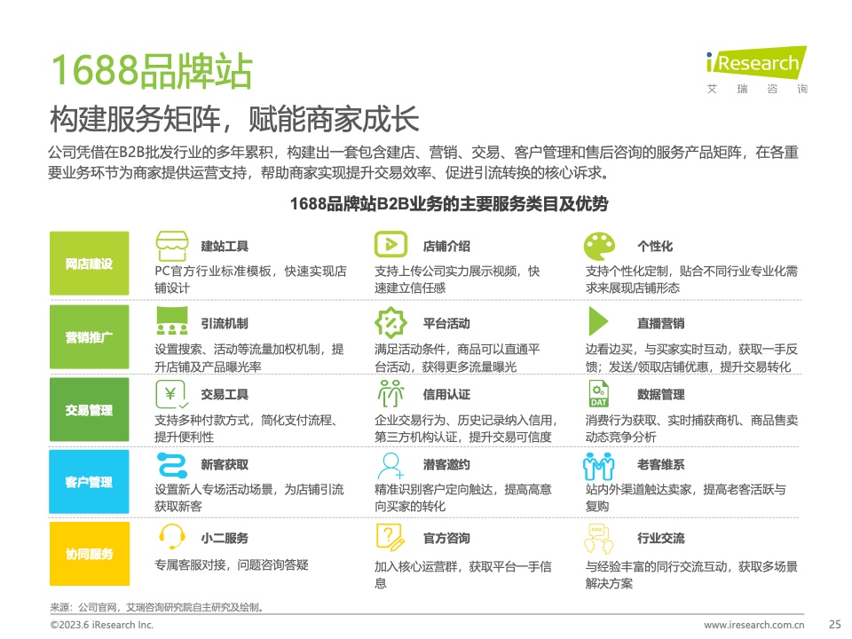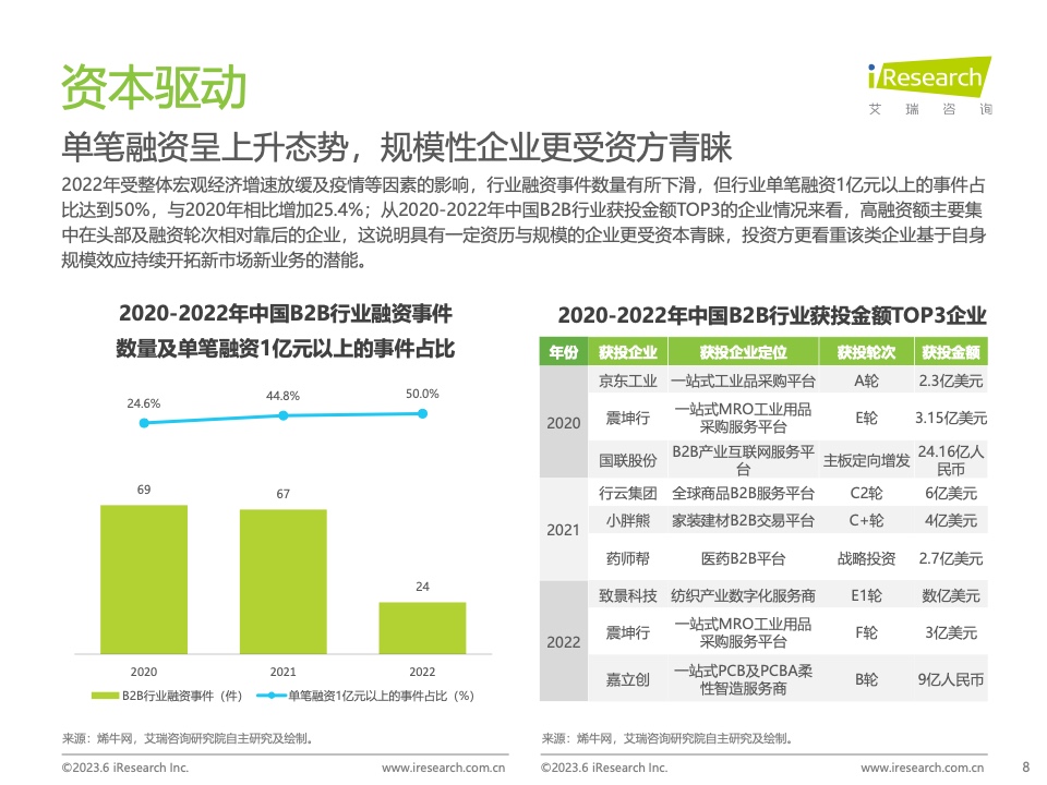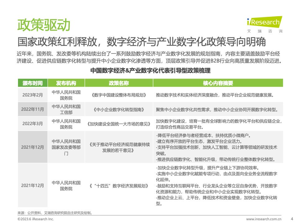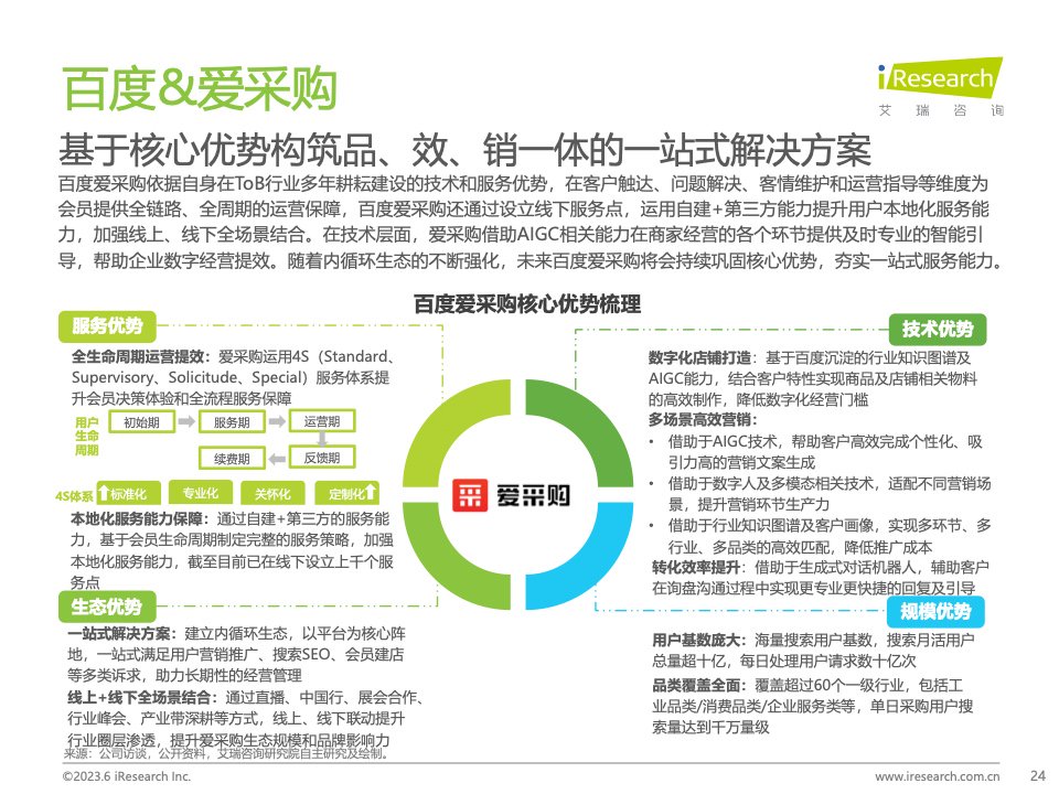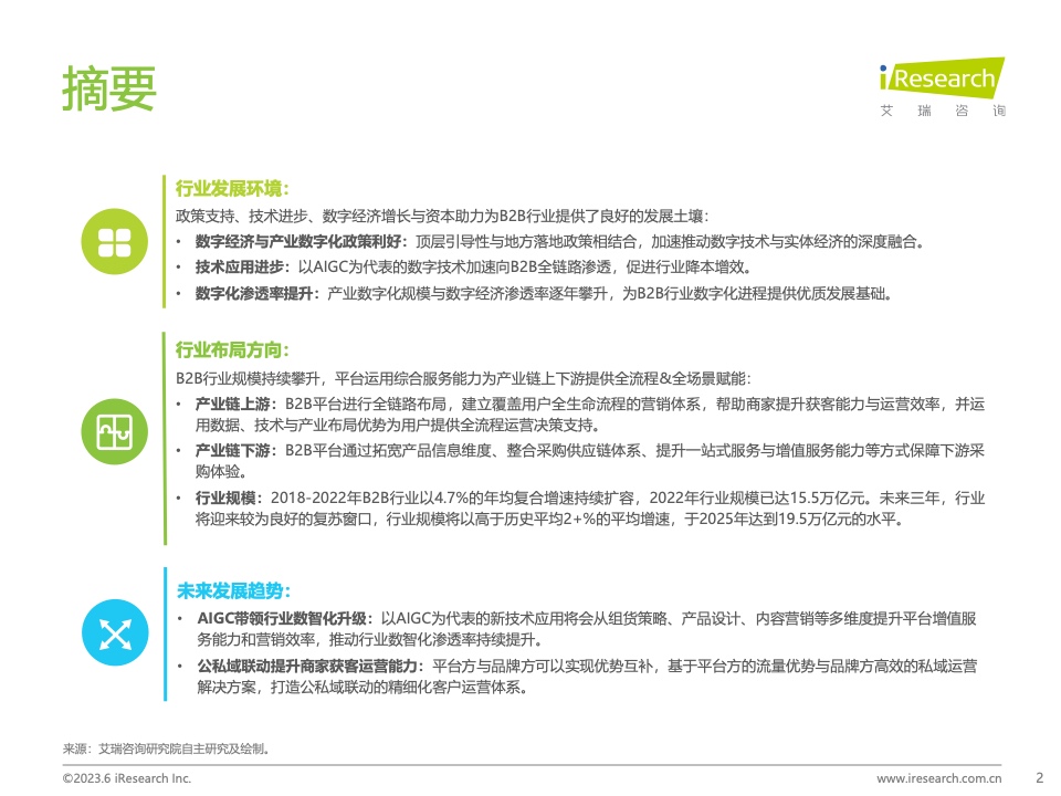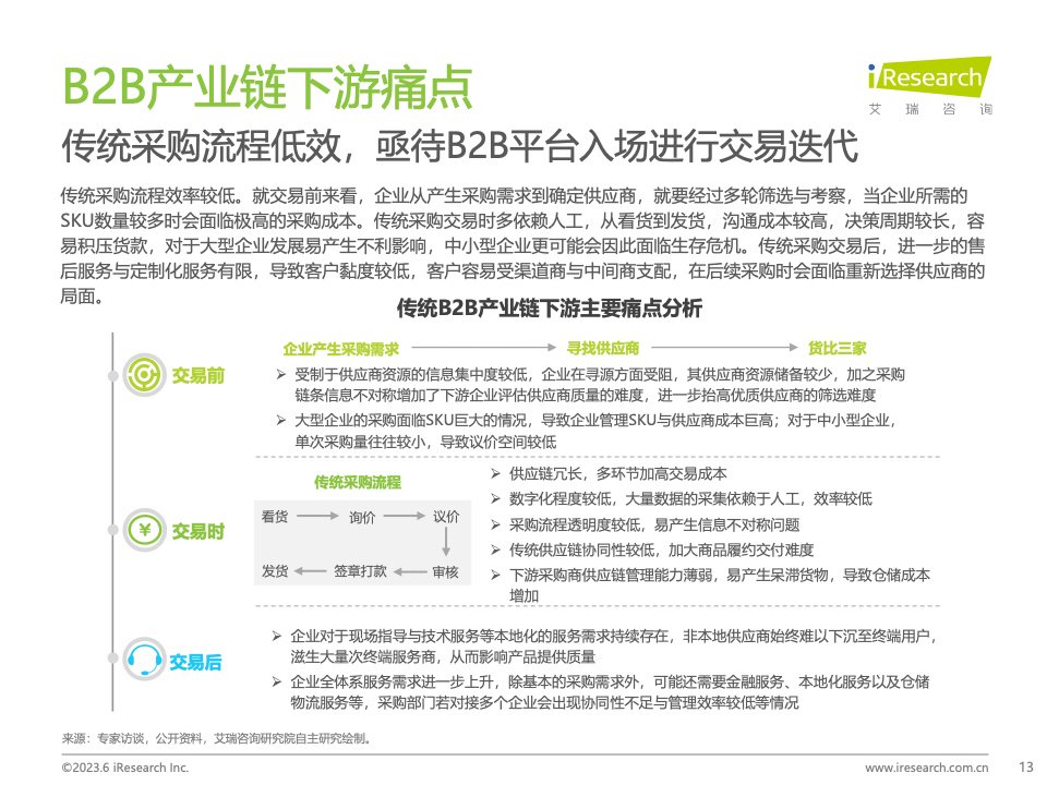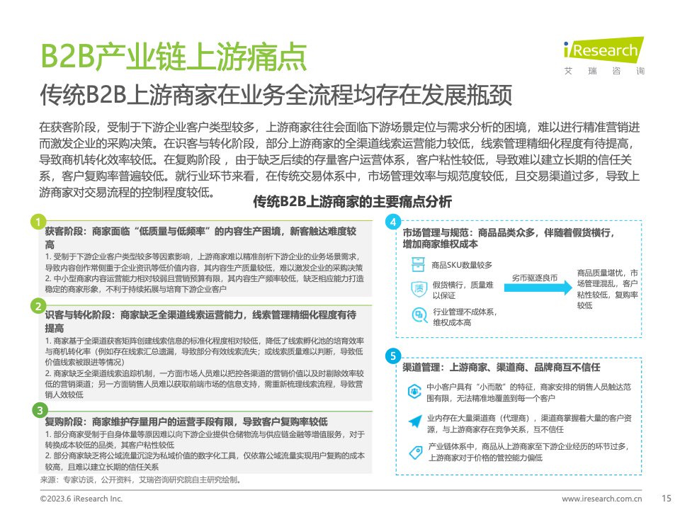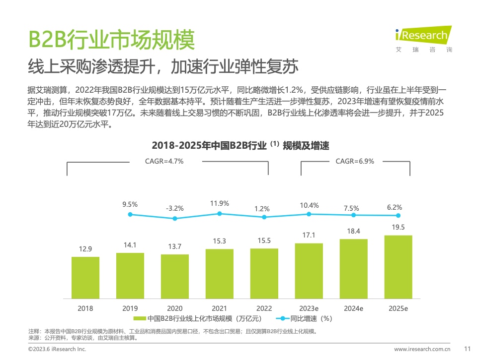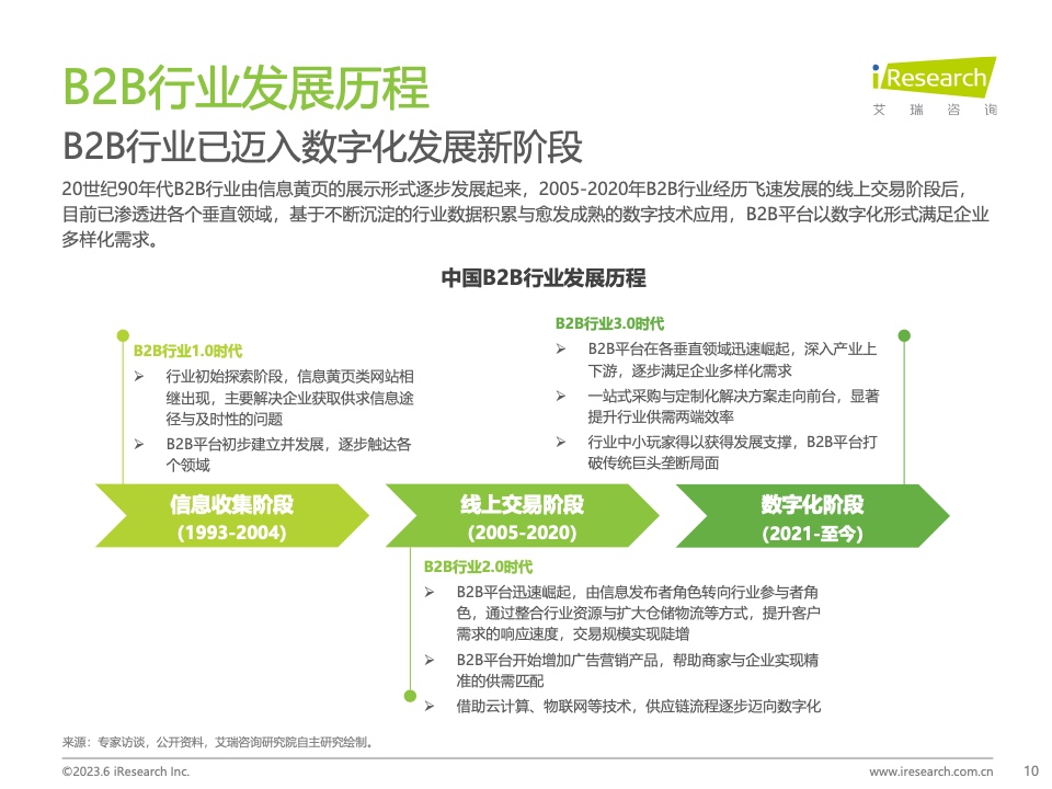 政策执行、技术进步、数字经济增长、资本助力,为B2B行业提供了良好的发展土壤。在这个过程中,B2B平台利用综合服务能力为产业链上下游提供全流程支持:对于产业链上游,平台建立覆盖用户全生命过程的营销体系,帮助商家提升获客能力和运营效率;对于产业链下游,平台通过拓宽产品维度、优化供应链体系、提升增值服务能力来保证客户的购买体验。随着AIGC技术和精细化运营能力的不断优化,未来B2B行业有望迎来进一步的数字化智能升级。