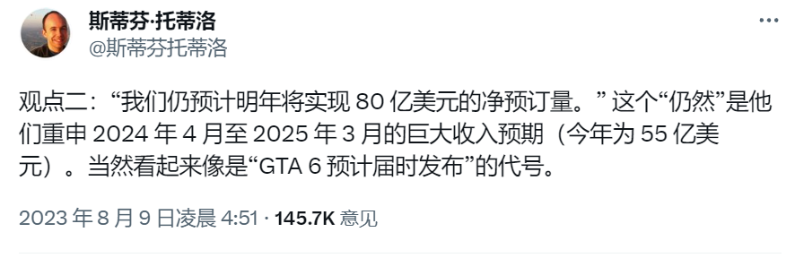 谁还在买GTA 6?虽然没有直接提到,但是还有其他线索。据参加T2电话会议的员工透露,T2管理层再次重申了下一财年的庞大销售目标,这一雄心也被很多人视为GTA 6发出的信号。