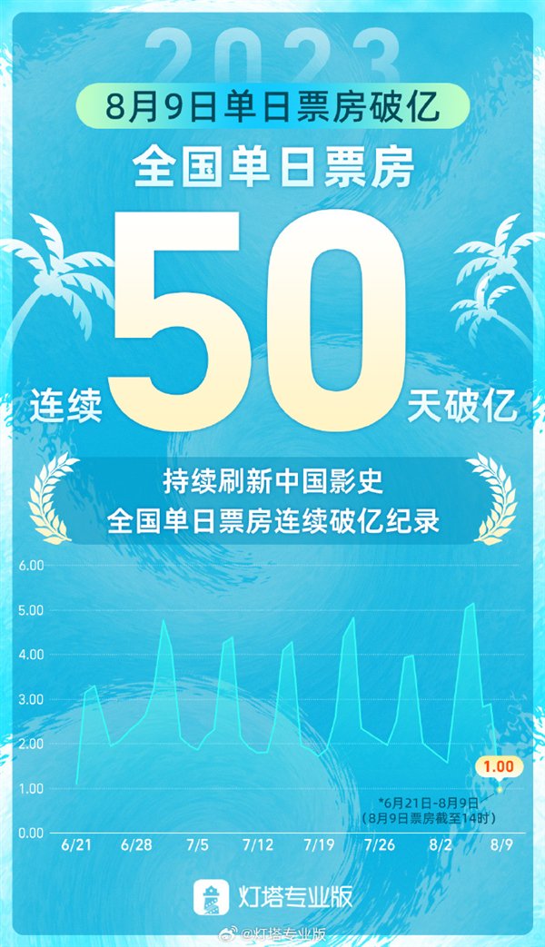 近日,灯塔专业版数据显示,截至8月9日14: 01,大市场票房破亿,全国票房连续50天破亿,连续刷新中国电影史上全国票房破亿纪录!