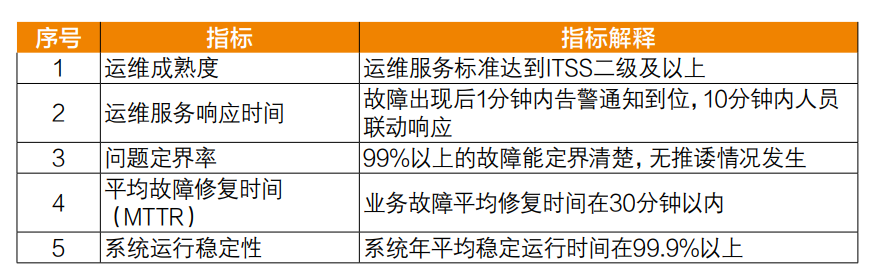 运维的基本目的是保障业务系统的平稳与安全运行,核心办法是减少、避免运维过程中潜在的人员、管理、技术等各类风险。集成运维模式通过制定规范的流程制度,提供更标准化、更稳定、更可靠的运维服务,降低业务中断序号指标指标解释1运维成熟度运维服务标准达到ITSS二级及以上2运维服务响应时间故障出现后1分钟内告警通知到位,10分钟内人员联动响应3问题定界率99%以上的故障能定界清楚,无推诿情况发生4平均故障修复时间(MTTR)业务故障平均修复时间在30分钟以内5系统运行稳定性系统年平均稳定运行时间在99.9%以上表1集成运维模式效果评估可参照的5个关键指标风险。依托运维管理平台,工作人员能够及时发现系统风险,在问题发生之前将其解决。