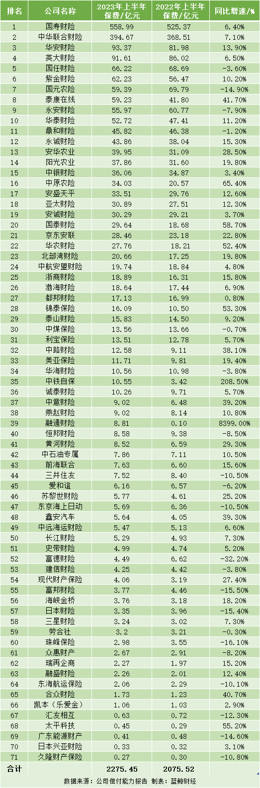 首先,关注保费规模。据蓝鲸财经统计,剔除数据为负的安心财险后,已披露偿付能力报告的71家未上市财险公司上半年共收取保险业务收入2275.44亿元,同比增长9.63%。