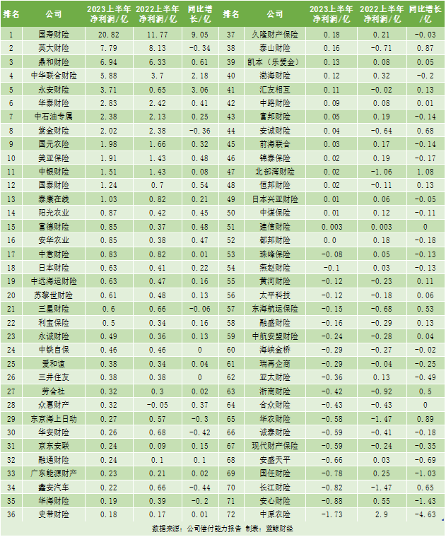 与去年同期相比,52家财险公司实现净利润正增长,占比超七成。中汇财险、泰山财险、汇友互助、安城财险、北部湾财险、恒邦财险等6家财险公司扭亏为盈。另有20家公司出现亏损,同时有7家公司由盈转亏。中原农险以1.73亿元的亏损排名第一,其次是安心财险,亏损8800万元。