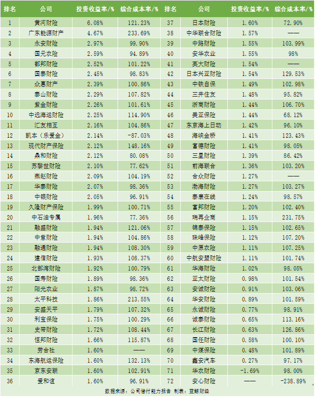 投资收益率最高的是黄河财险,达到6.08%,其次是粤能财险和永安财险,分别以4.67%和2.97%的投资收益率位列第二和第三。国源农业保险以2.59%的投资回报率排名第四,是前十名中唯一的农业保险公司。