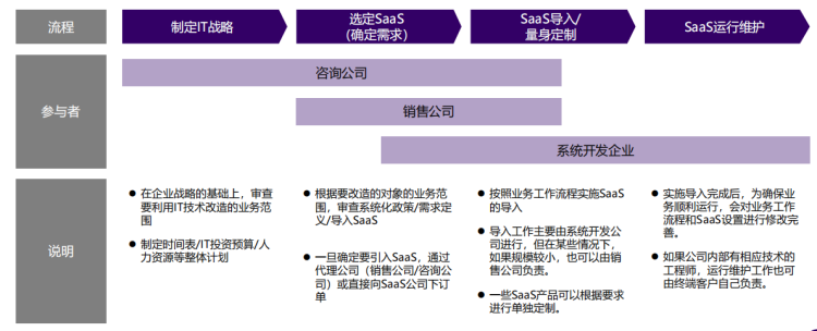 在销售、实施和服务过程的各个阶段,不同角色的生态伙伴的分工: