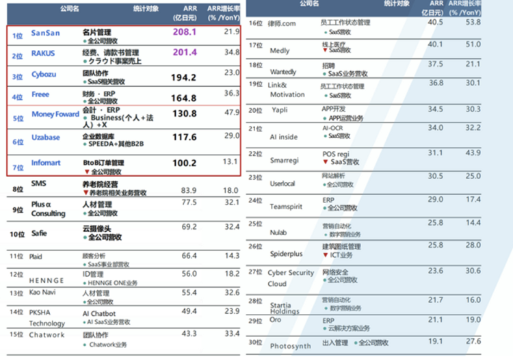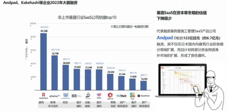 过去一年SaaS领域投融资金额持续增长,但投融资企业数量减少,资金向少数头部企业集中。在SaaS遇冷的情况下,LegalOn Technologies(原LegalForce)、Andpad等企业2022年仍然融资超过100亿日元(约5.5亿元人民币)。