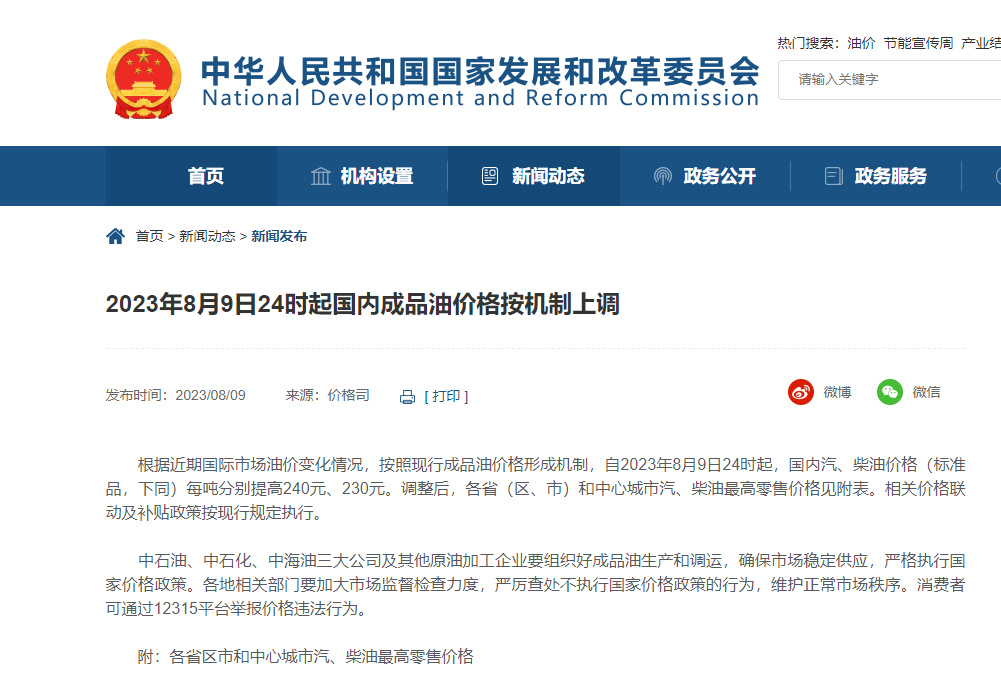 红星资本局8月9日消息,官方网站国家发改委今日宣布,自24时起,国内汽油价格和柴油价格分别上调240元/吨和230元/吨。
