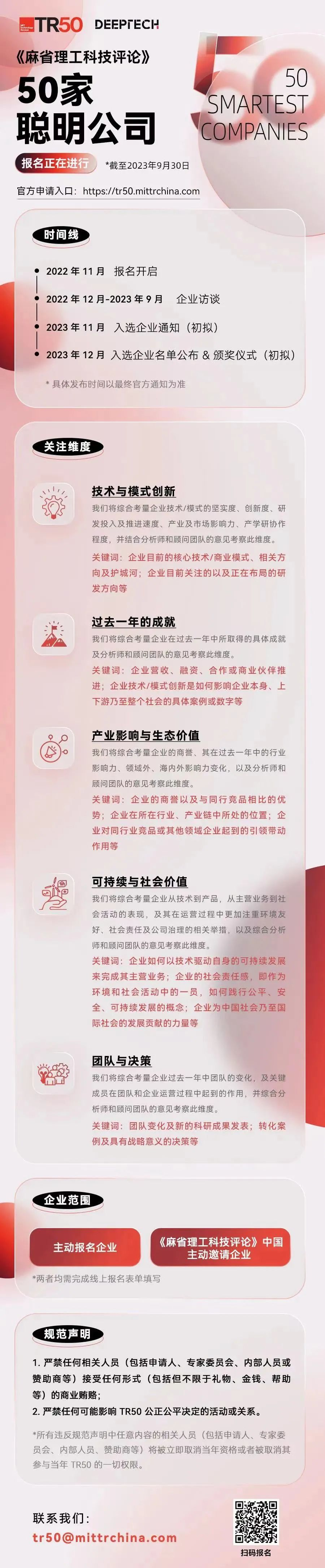 2018年,“50家智慧公司”正式登陆中国,从中国和中国的角度寻找和筛选可能影响世界的智慧公司。三年来,《麻省理工科技评论》中国版以“中国支点”(2019)、“中国凝聚力”(2020)、“中国引领”(2021)等概念完成评选。2023年,在可持续发展的基调下,我们将继续在全球范围内寻找关注“在中国、由中国、为中国”的新兴科技和创新商业力量。