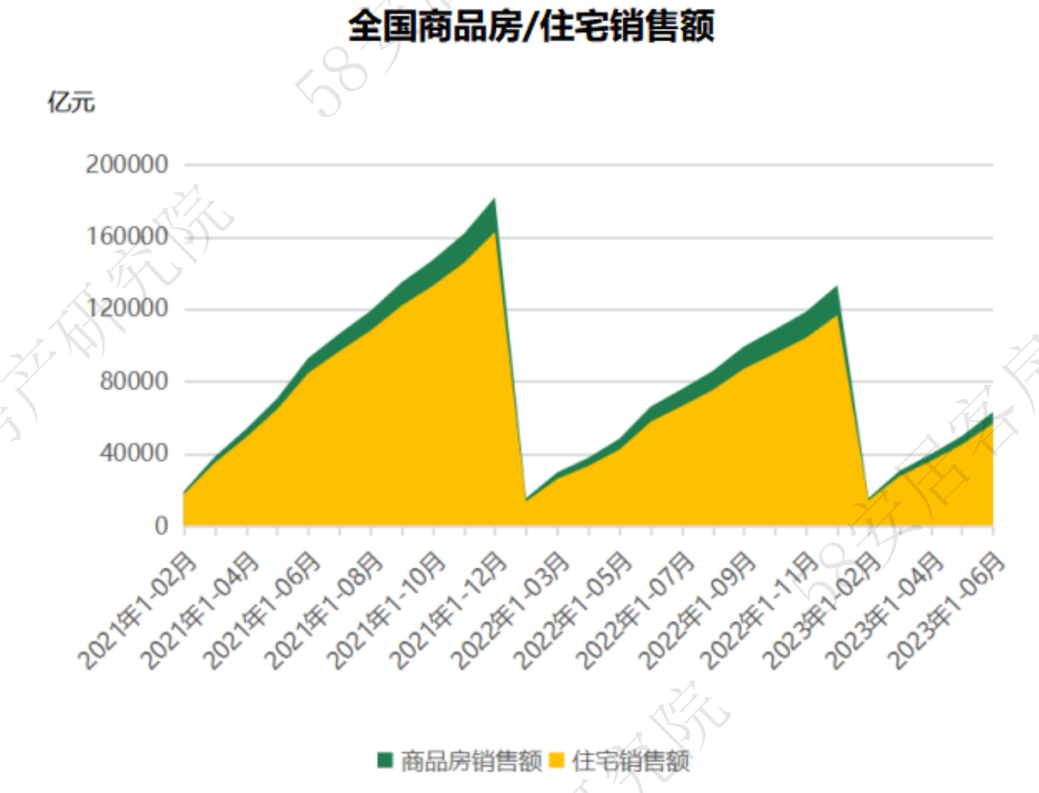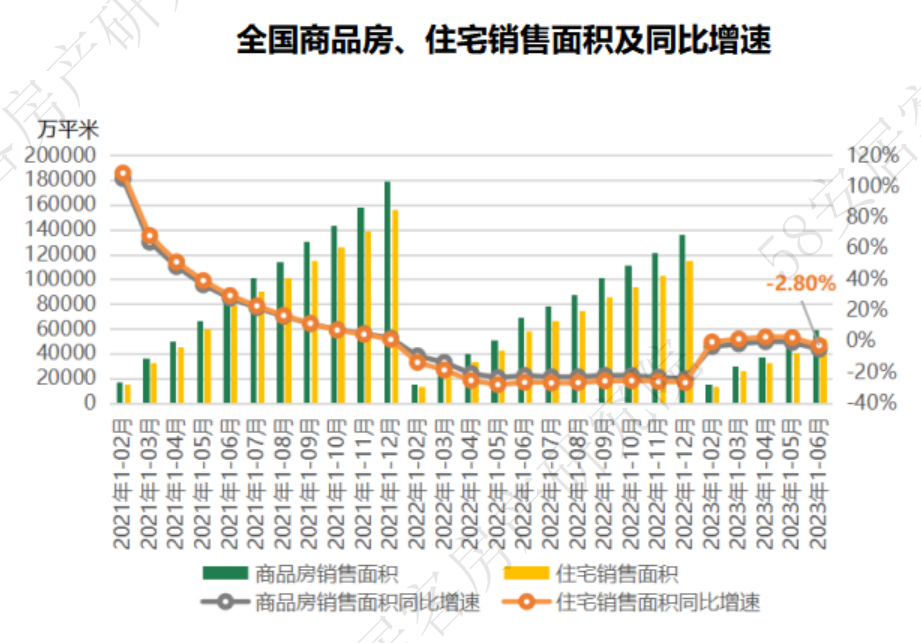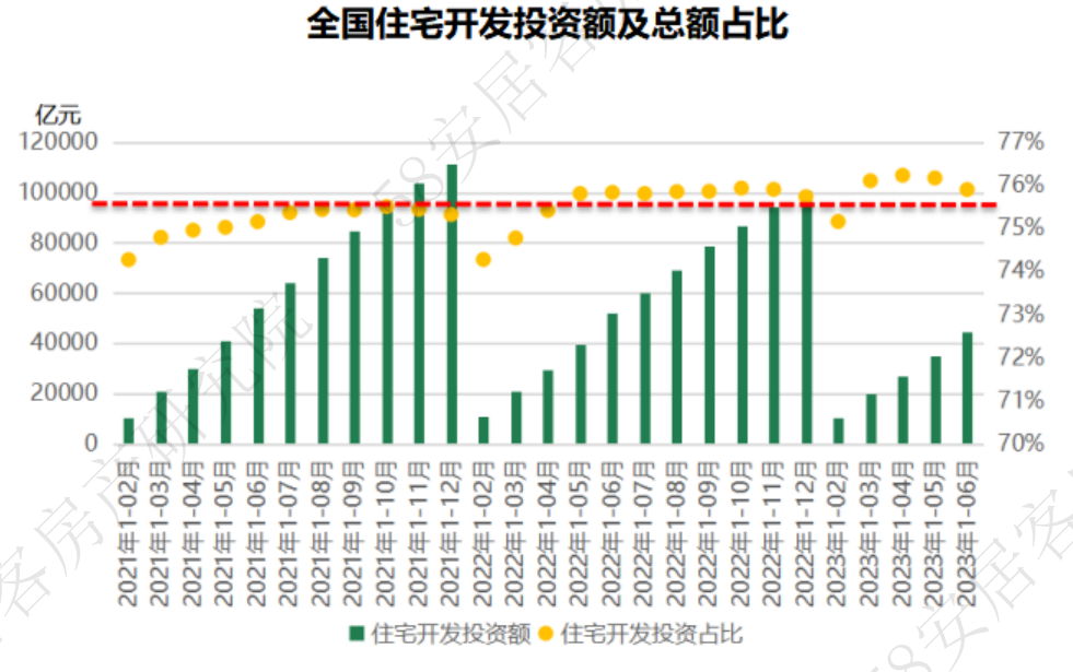 2023年1-6月,全国房地产开发和住宅开发投资分别为58550亿元和44439亿元,同比分别下降7.9%和7.3%。住宅开发投资占全部房地产开发投资的75.90%,略高于去年同期,住宅投资仍是全行业关注的焦点。