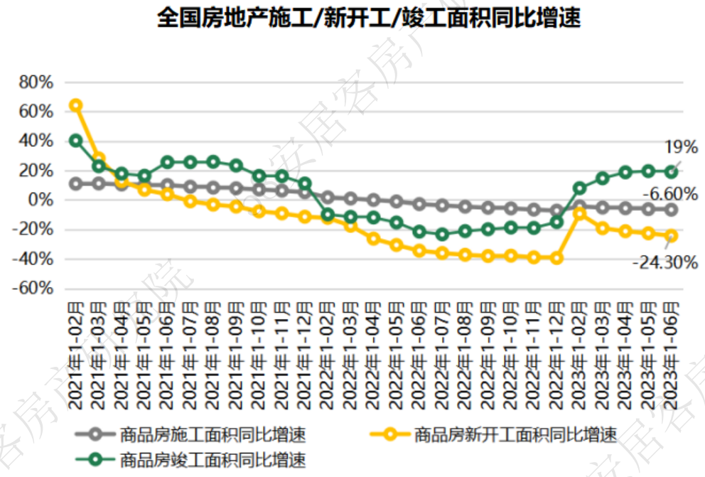 2023年1-6月,全国房屋新开工面积49880万平方米,同比下降24.3%,降幅比上月扩大1.7个百分点;全国房屋施工面积791548万平方米,同比下降6.6%,降幅扩大0.4个百分点。但竣工端保持回暖趋势。1-6月,房屋竣工面积33904万平方米,同比增长19%,住宅竣工面积24604万平方米,同比增长18.5%。