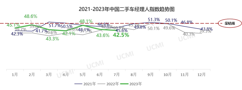 2023年8月1日,中国汽车流通协会发布了最新一期中国二手车经理人指数(UCMI)。本期UCMI结果显示,7月二手车经理人指数为42.5%,较6月下降1.1个百分点,仍低于阈值,二手车市场不活跃。
