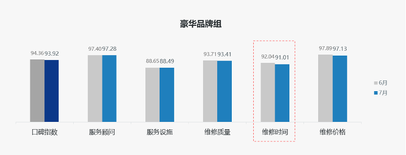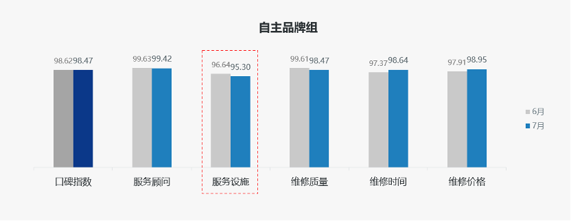 自主品牌组:自主品牌组售后服务口碑指数为98.47分,环比下降0.15分;本月售后服务五维度评分中,服务设施维度下降1.34分,维修时间维度上升1.27分。