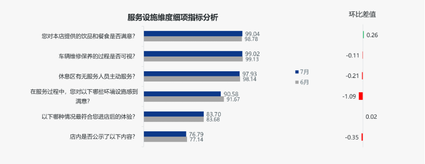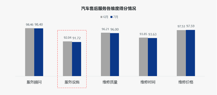 汽车售后服务五个维度中,只有维修价格环比上升0.06分,其他维度均环比下降,其中服务设施维度环比下降0.32分。