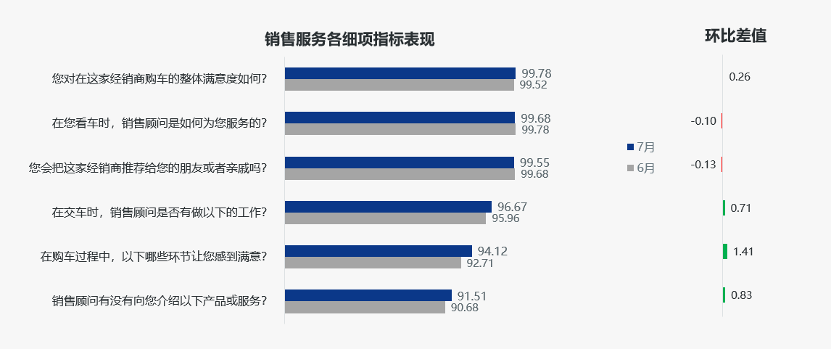 在销售服务的详细指标中,“在购车过程中,以下哪个环节让您感到满意?”环比大幅增长,达到1.41点;“你看车的时候,销售顾问是怎么为你服务的?”以及“你会向你的朋友或亲戚推荐这个经销商吗?”分别下降0.10点和0.13点。
