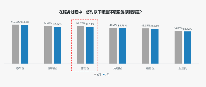 进一步分析“在服务期间,您对以下哪些环境设施感到满意?”该指数发现,“休息区”的满意度下降幅度最大,达到1.83%,其次是“卫生间”,下降幅度为1.42%。