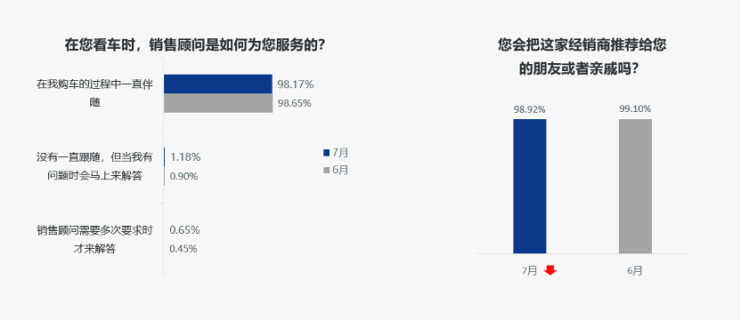 继续分析这个月销售服务的弱项,包括“你看车的时候销售顾问是怎么为你服务的?”指标中,“我没有一直跟着,但有问题会马上回答”的比例较上月上升0.28%;"你会向你的朋友或亲戚推荐这个经销商吗?"指标中,表示会推荐的消费者比例环比下降0.18%。