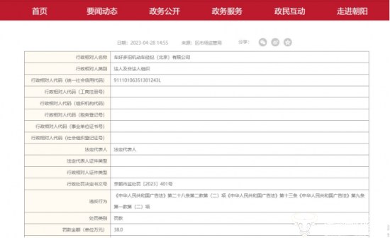 值得注意的是,经营瓜子二手车的多家二手车经纪(北京)有限公司于2023年4月27日收到京朝市监罚[2023]401号罚款,因发布虚假广告、贬低其他生产经营者被北京市朝阳区市场监督管理局罚款38万元。