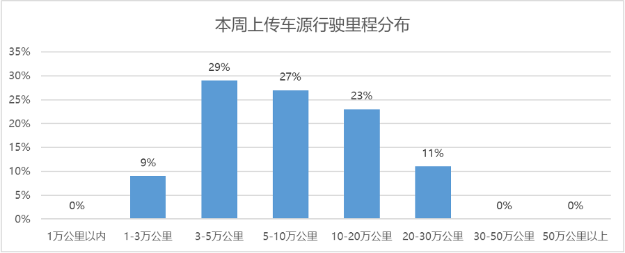 从上传的车源里程数据来看,本周上传的数据中,5万公里以内的“新车”数据比上周下降了1%,5-10万公里的“性价比”车源数据也比上周下降了1%,10万公里以上的车源数据上升了1%。