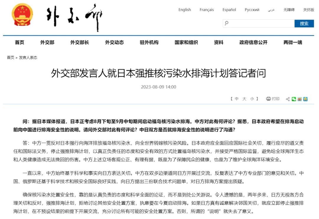 外交部发言人就日本强行向海洋排放核污染水计划答记者问