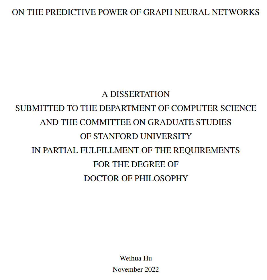 2023年杰出博士论文奖授予斯坦福大学胡博士(今年1月获得学位)的论文“关于图形神经网络的预测能力”。
