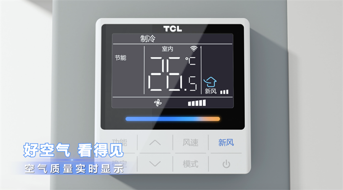 难能可贵的是,TCL空调小蓝翼新风管机还设置了实时空气质量检测条,通过橙蓝色的变化可以直观了解室内空气质量。蓝色代表空气质量优良,橙色代表空气质量较差,可见空气良好。为避免过滤失效造成的新风二次污染,滤芯使用寿命低于20%时会智能提醒,方便用户及时更换,使净化效果持续有效。