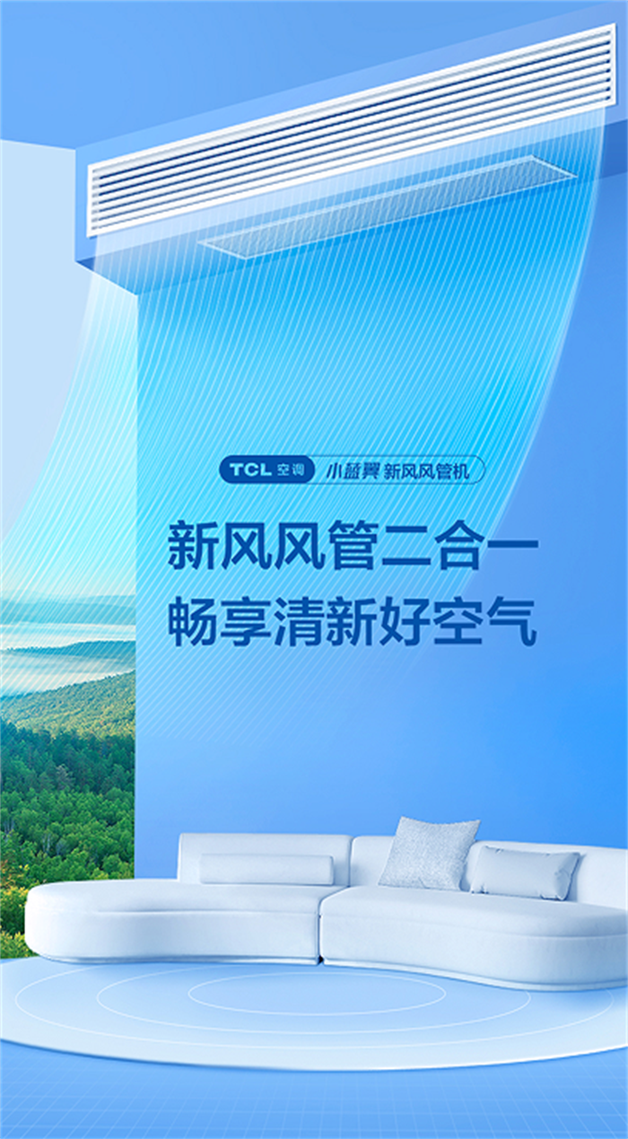 TCL小蓝翼新风管机既是空调又是新风风机,可以更好的净化空气。一机多用,一站式解决夏季全屋凉爽健康空气的双重需求。在家里的客厅里适配这样的新风换气机,可以让你在家里很舒服,度过炎热的夏天。