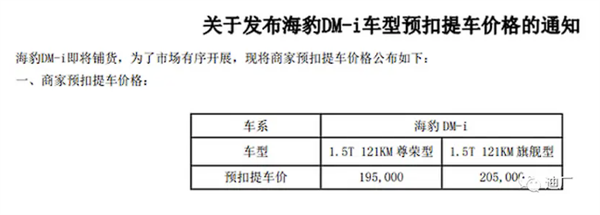 快科技讯8月9日,近日,比亚迪车友曝光了一辆豹DM-i代扣提高车价。新车预计推出两款车型,其中121 KM高级车售价19.5万元,121 KM旗舰车售价20.5万元。