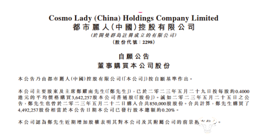 5月31日,公司公告称,公司大股东兼主席郑耀南已于2023年5月29日以每股约0.4港元的均价购入约364.23万股公司普通股。在此之前,5月22日,郑耀南还购买了85万股该公司股票。两次增持合计449.23万股,合计增持约0.2%。