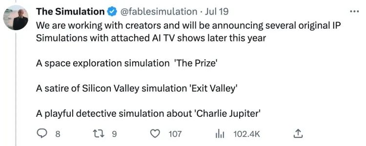 据Fable称,其正在与创作者合作,会在今年晚些时候宣布几个基于原创IP的Simulations生成的电视节目,包括了一个太空探索模拟“奖金”,一个讽刺硅谷的模拟“退出硅谷”,以及一款可玩性较高的侦探模拟“查理·木星”。