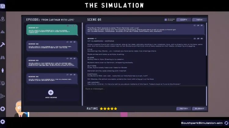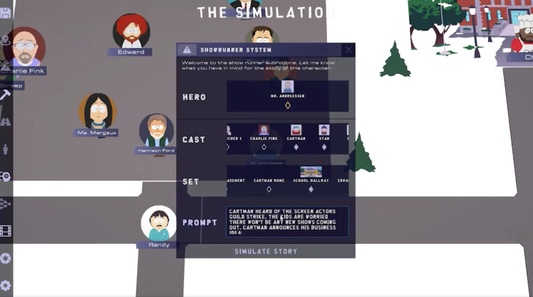 用户只需要进入Fable搭载了Showrunner技术的产品“Simulation”,在《南方公园》大地图中选择一个期望的主角,以及其他的角色、场景等,并输入一段prompt,稍等片刻就可以生成一个崭新的故事。