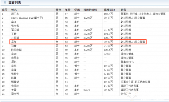 根据年报中的信息,吴红出生于1970年,现年53岁。她拥有清华大学硕士学位,第一学历尚未公布。不清楚她清华的硕士是全日制还是EMBA,两者差距很大。此外,她拥有加拿大永久居留权。