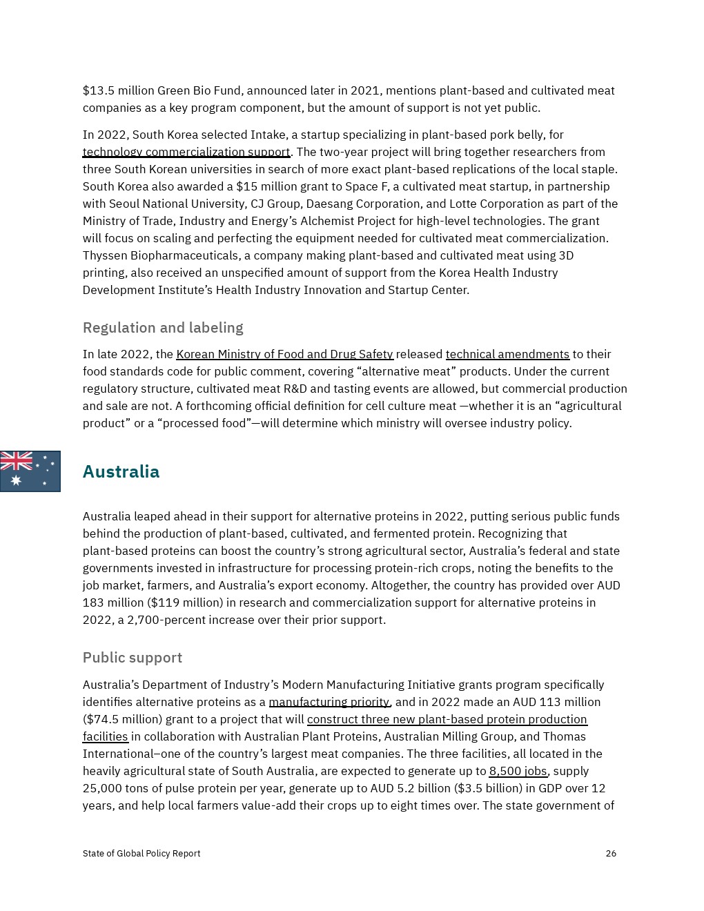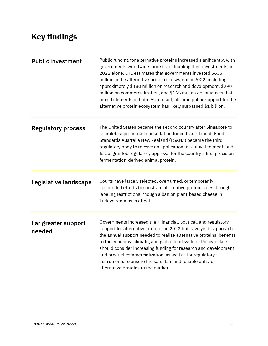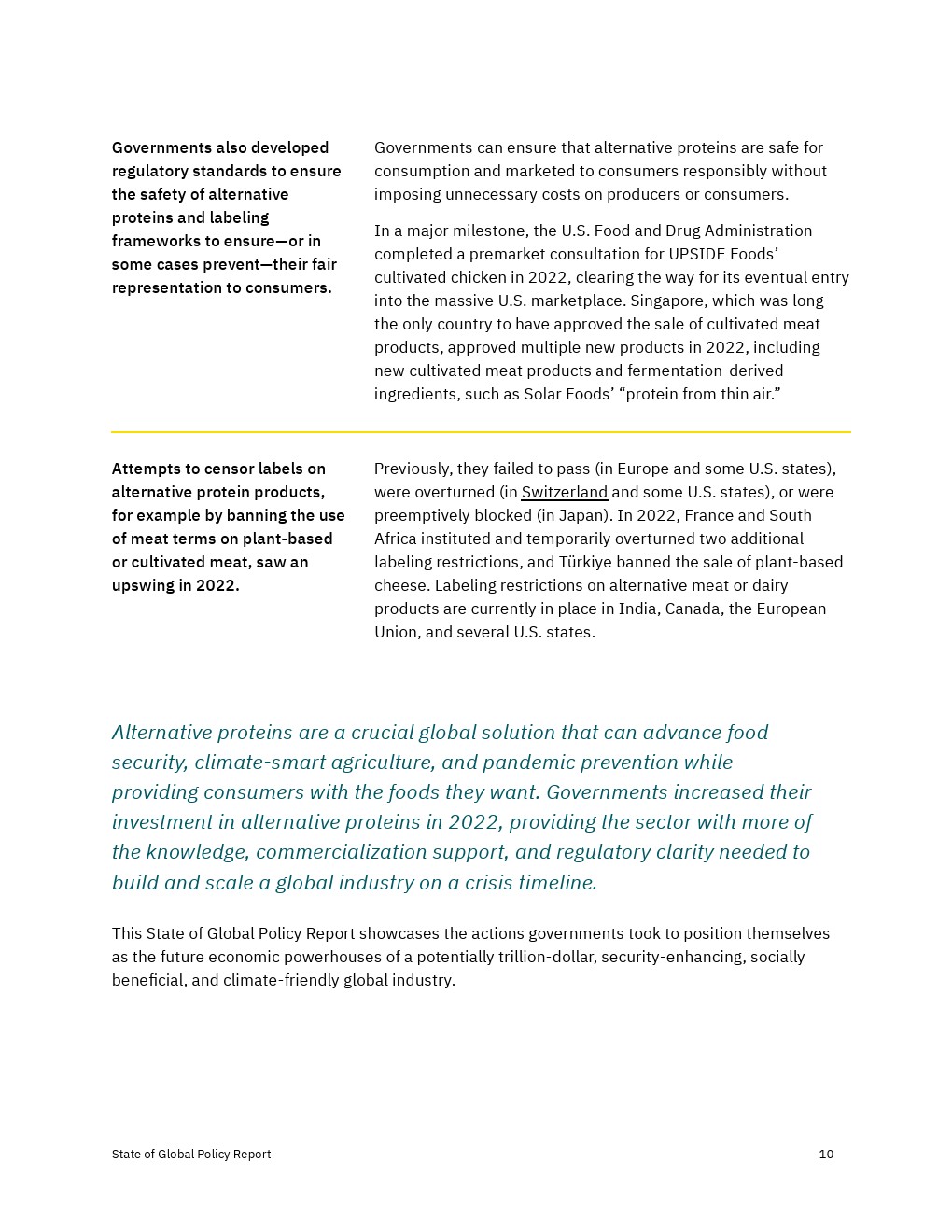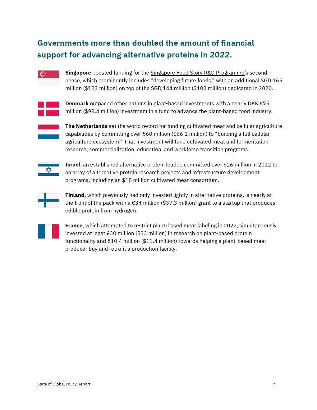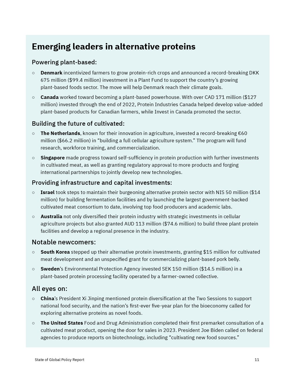 各国政府加大了对2022年替代蛋白质的财政、政治和监管支持,但还没有达到实现替代蛋白质对经济、气候和全球粮食系统的益处所需的水平。决策者应考虑增加对R&D和产品商业化的资助,以及监控工具,以确保蛋白质安全、公平和可靠地进入市场。