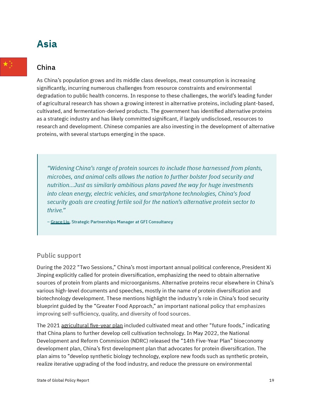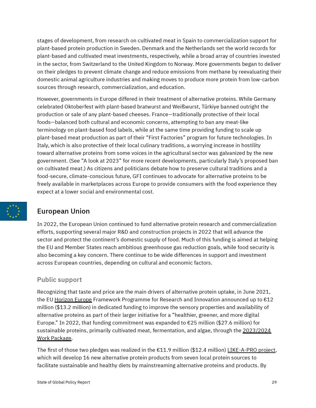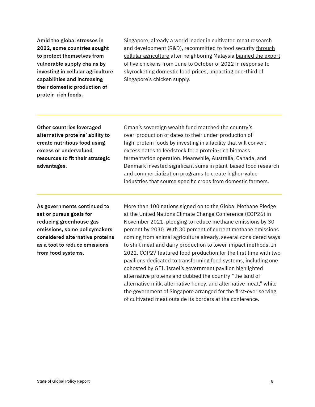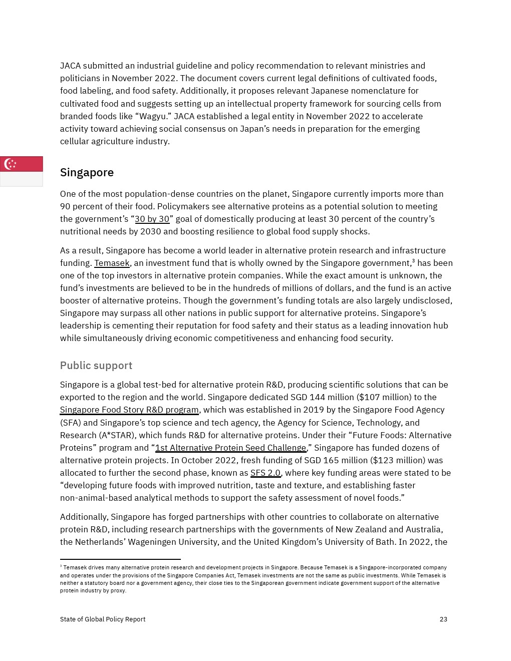 各国政府加大了对2022年替代蛋白质的财政、政治和监管支持,但还没有达到实现替代蛋白质对经济、气候和全球粮食系统的益处所需的水平。决策者应考虑增加对R&D和产品商业化的资助,以及监控工具,以确保蛋白质安全、公平和可靠地进入市场。