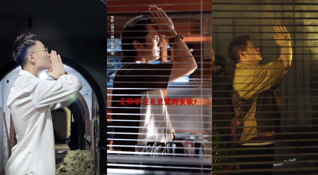 而王传君的诈骗头子也有很多亮点。比如在一个堆满钞票的房间里,他用手自杀,暗示手下人说完,转过头,双手合十,高昂着头,在高台上祭拜神灵。这些极度紧张的片段,在短视频平台上带出很多模仿和创新。