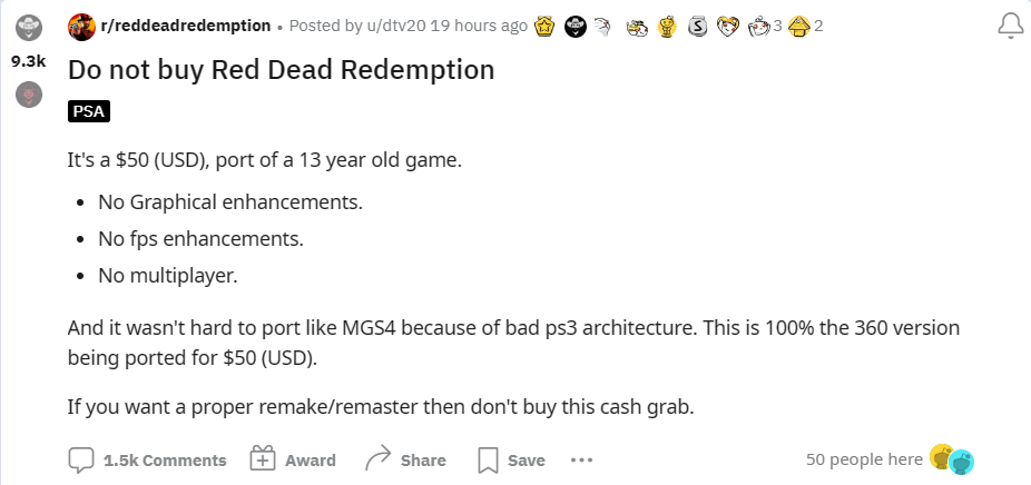 在fistful of dollars的Reddit版块,大家已经达成了“拒绝发钱”的共识,而在其他平台,玩家的失望随处可见。考虑到GTA三部曲刚上映时的糟糕表现,大家的担心和失望其实是可以理解的。