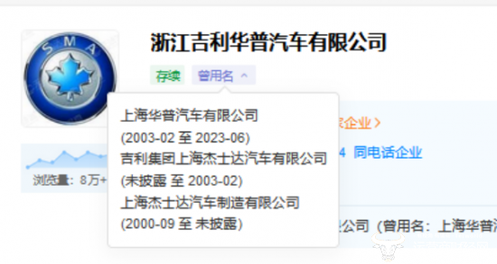 天眼查APP显示,浙江吉利华普汽车有限公司曾名为上海华普汽车有限公司。