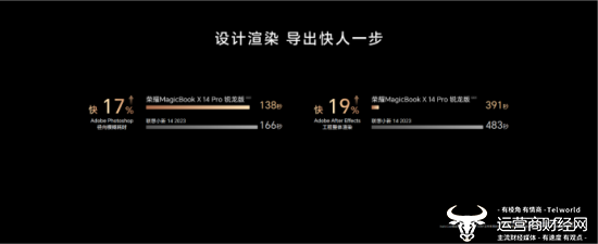 荣耀MagicBook X Pro系列锐龙版是首批搭载最新AMD锐龙7 7840HS标准压力处理器的同档轻薄本,性能卓越。芯片采用全新4nm制程工艺和Zen4架构,8核16线程,最高加速时钟频率可达5.1GHz,单核性能提升15%。在Photoshop和AE渲染导出大文件的场景下,仅需138秒和391秒,渲染导出速度相比竞品提升高达19%,大大提高了用户的工作和学习效率。